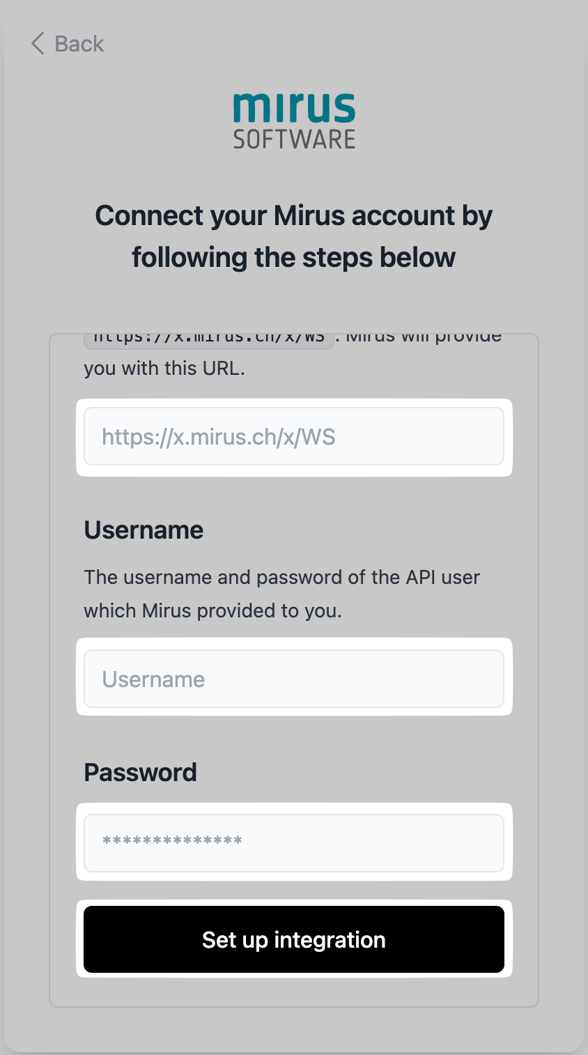 Could you please provide us with the base URL, and the username and password for an API user? - After receiving the base URL, username, and password, enter them in the connection flow, and press Set up integration