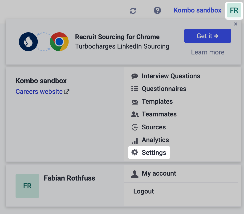 - In your Spark Hire Recruit dashboard, click on your profile and then go to the settings.