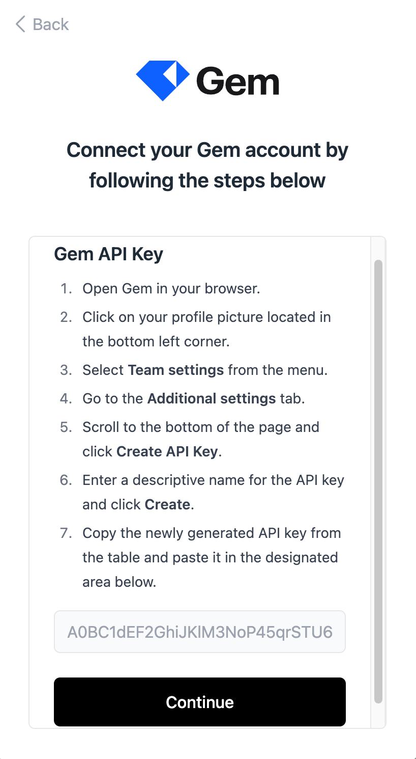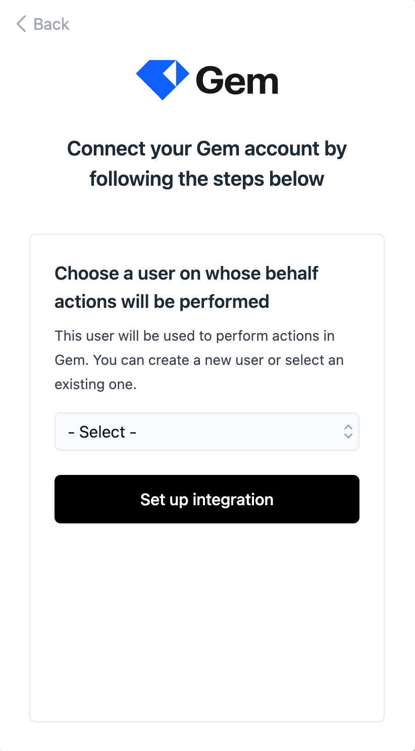 Every Action executed in Gem, like adding a comment, uploading a CV, moving an application to another stage requires to be attributed to a User. Select the responsible User in the connection flow. Optionally you can create a new User within Gem for just this purpose.