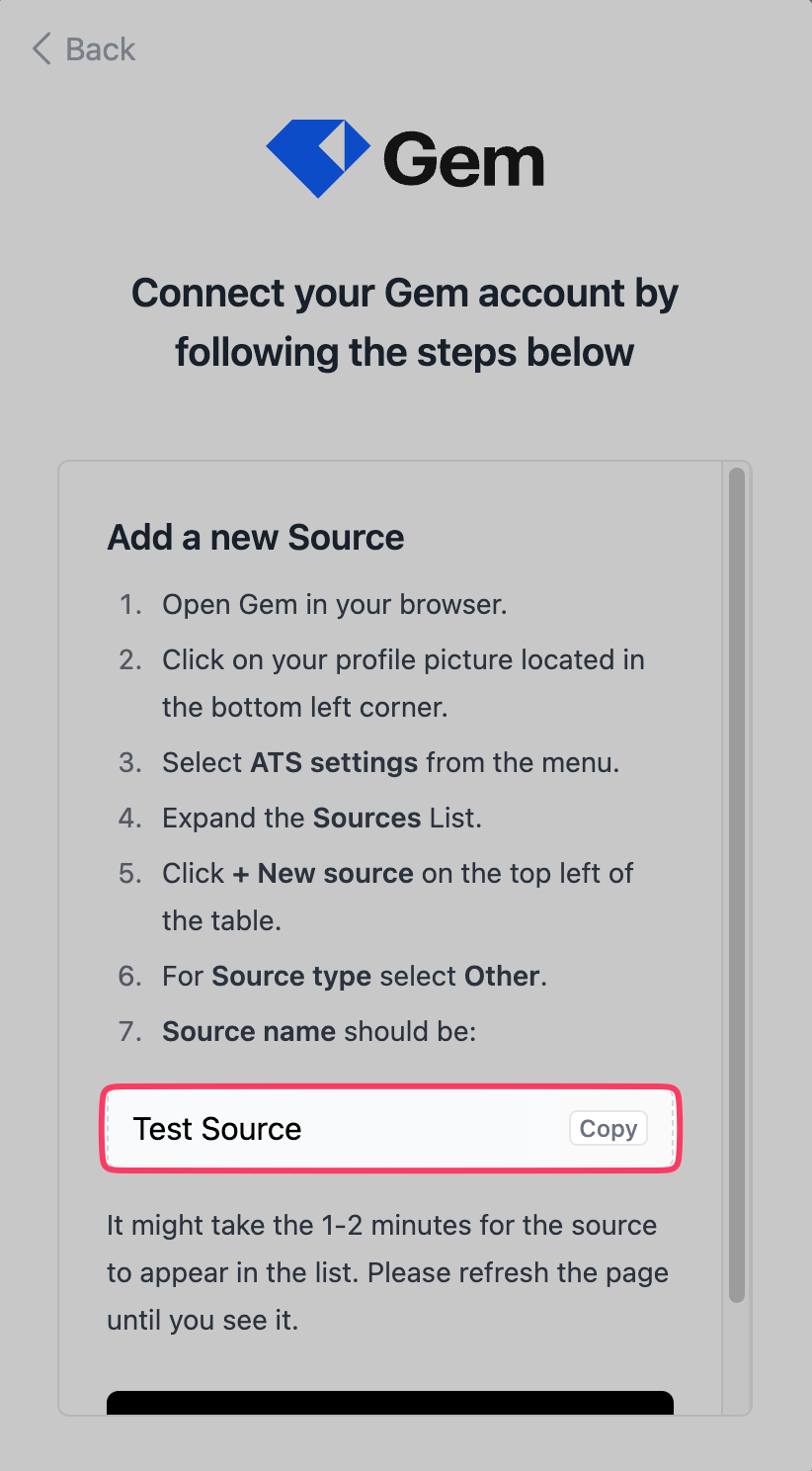 - Go to the Gem ATS tab, click on Applications and expand the Sources list. Then click on New source.