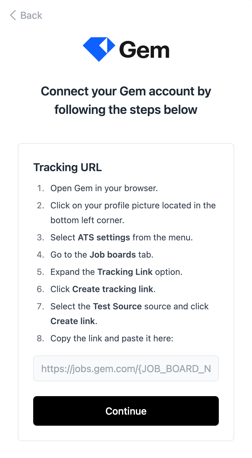 - Go to the Gem ATS tab, click on Job boards & posts and expand the Tracking link section. Then click on Create tracking link.