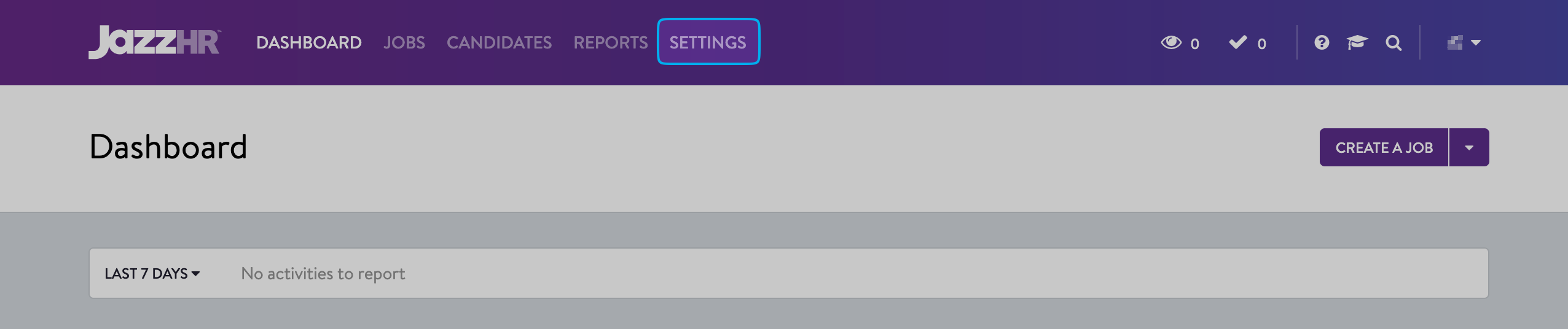 1. Log in to JazzHR, and click "SETTINGS" at the top of the screen.