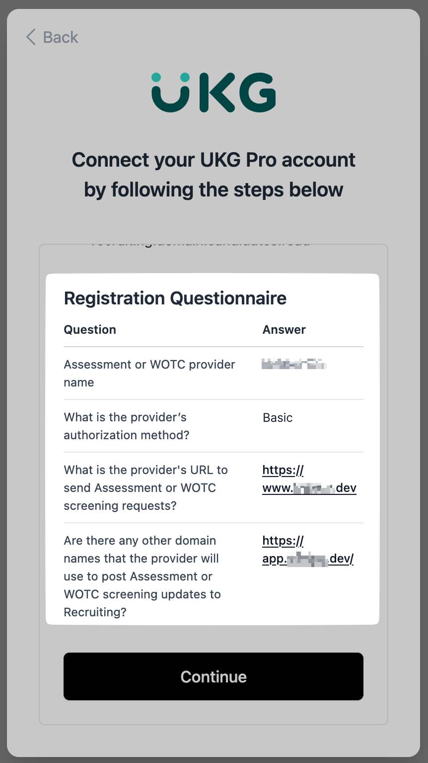 Setting up a UKG Pro assessment integration requires UKG's support. Please get in touch with UKG support or your success manager with the draft message from the connection guide. In the message, please include the list of questions and answers below.