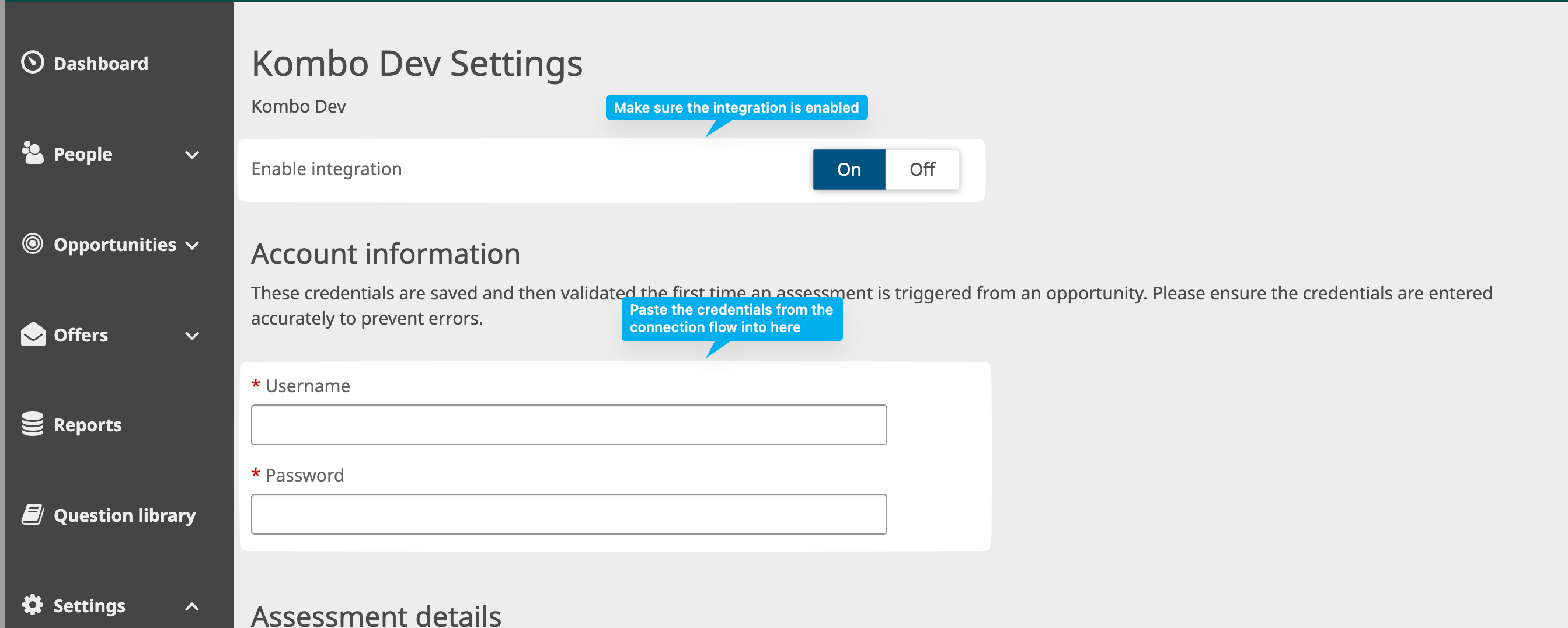 We wish to integrate an assessment provider with our UKG Pro Recruiting instance. Could you please set up an assessment integration with the following options: