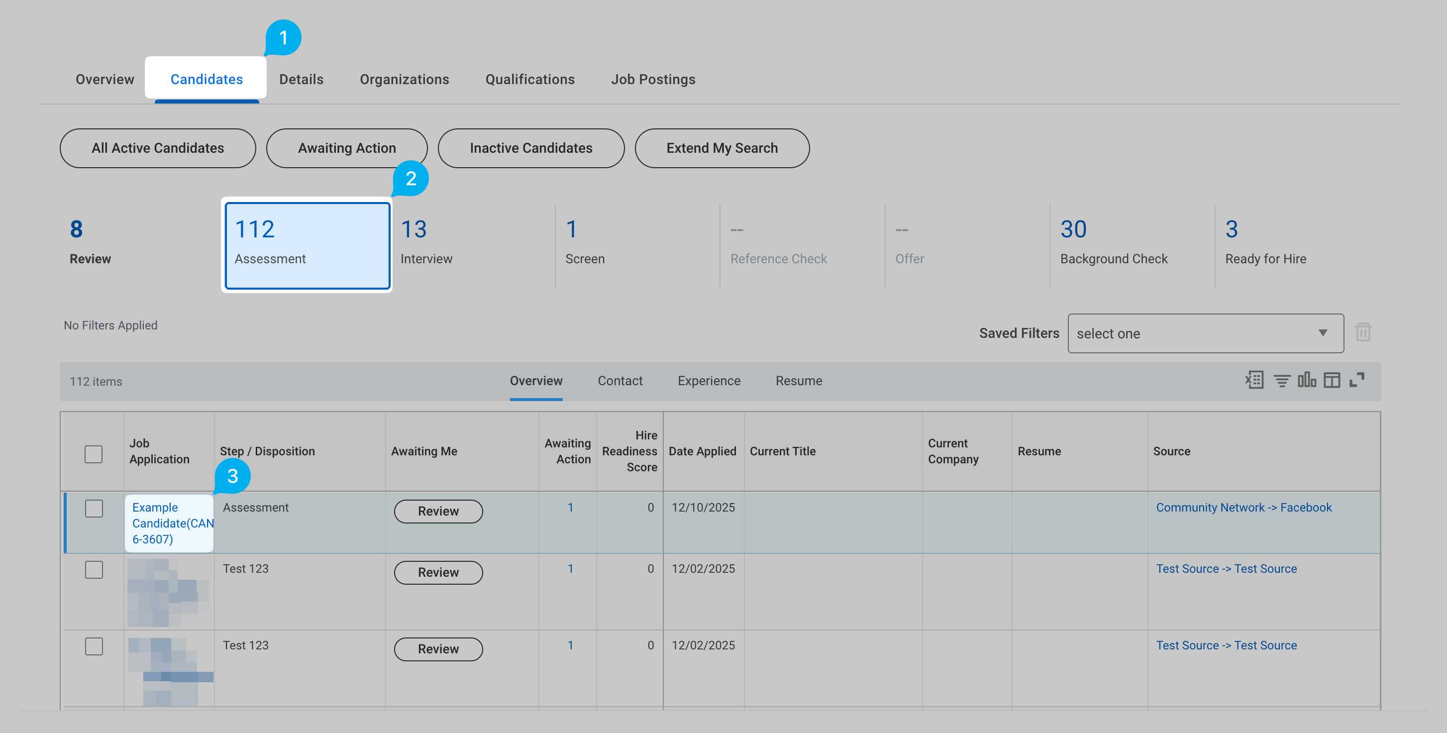 - Go to the "Candidates" view for a job requisition, filter the candidates in the "Assessment" stage, and click on a candidate's name: