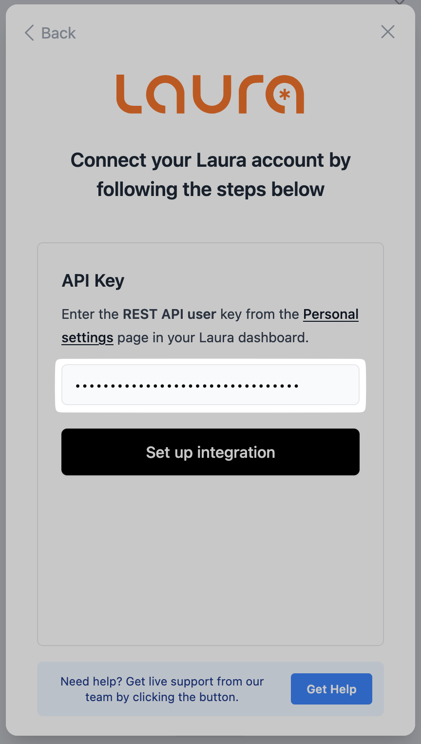 0. Before getting started linking your account, you will need to request API access from the Laura team. For this, you can send you the following email to your account manager: