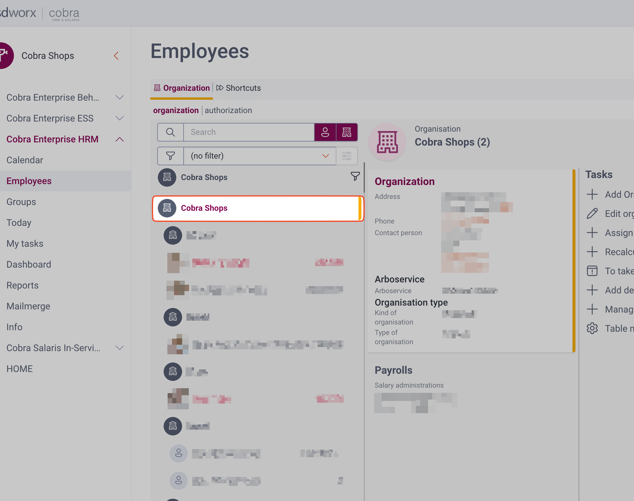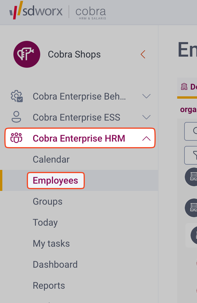 - After logging in to your SD Worx Cobra instance, click on Cobra Enterprise HRM > Employees in the left sidebar