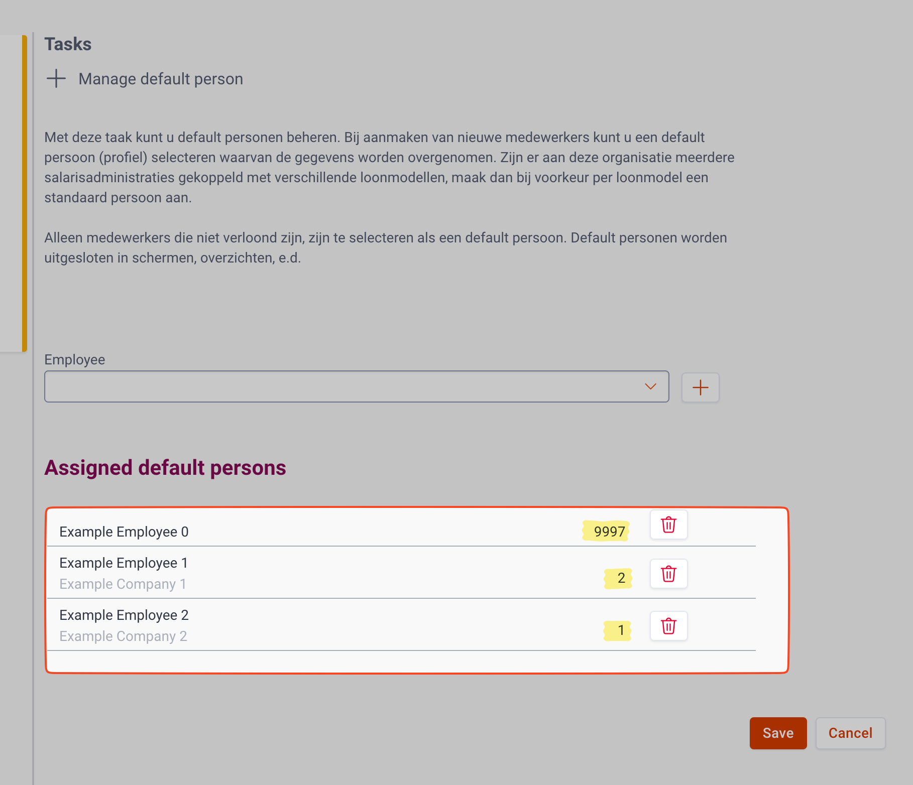 - The Assigned default persons on the bottom of this page are the standard employees you can use. Just copy the number of your desired standard employee on the right-hand side (next to the delete button) and paste them into the Create Employee form's Standard Employee field.