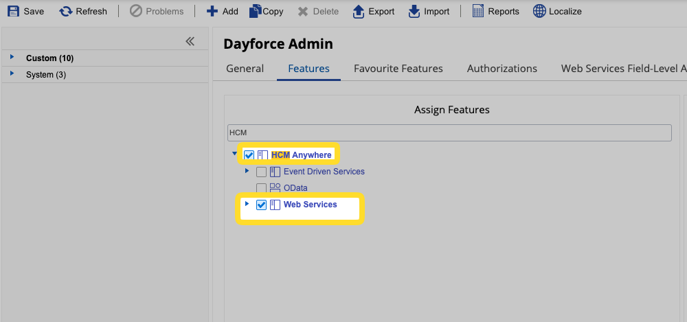 Navigate to Features. Ensure HCM Anywhere and Web Services are checked