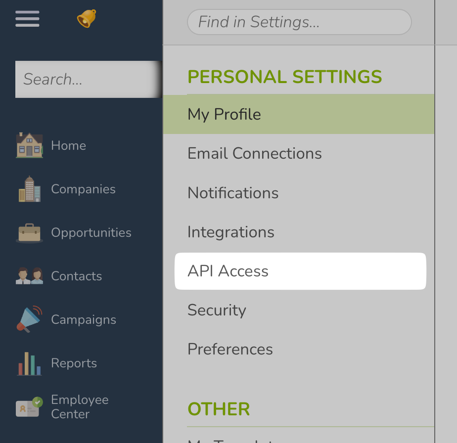 - Click on "API Access" under "PERSONAL SETTINGS":