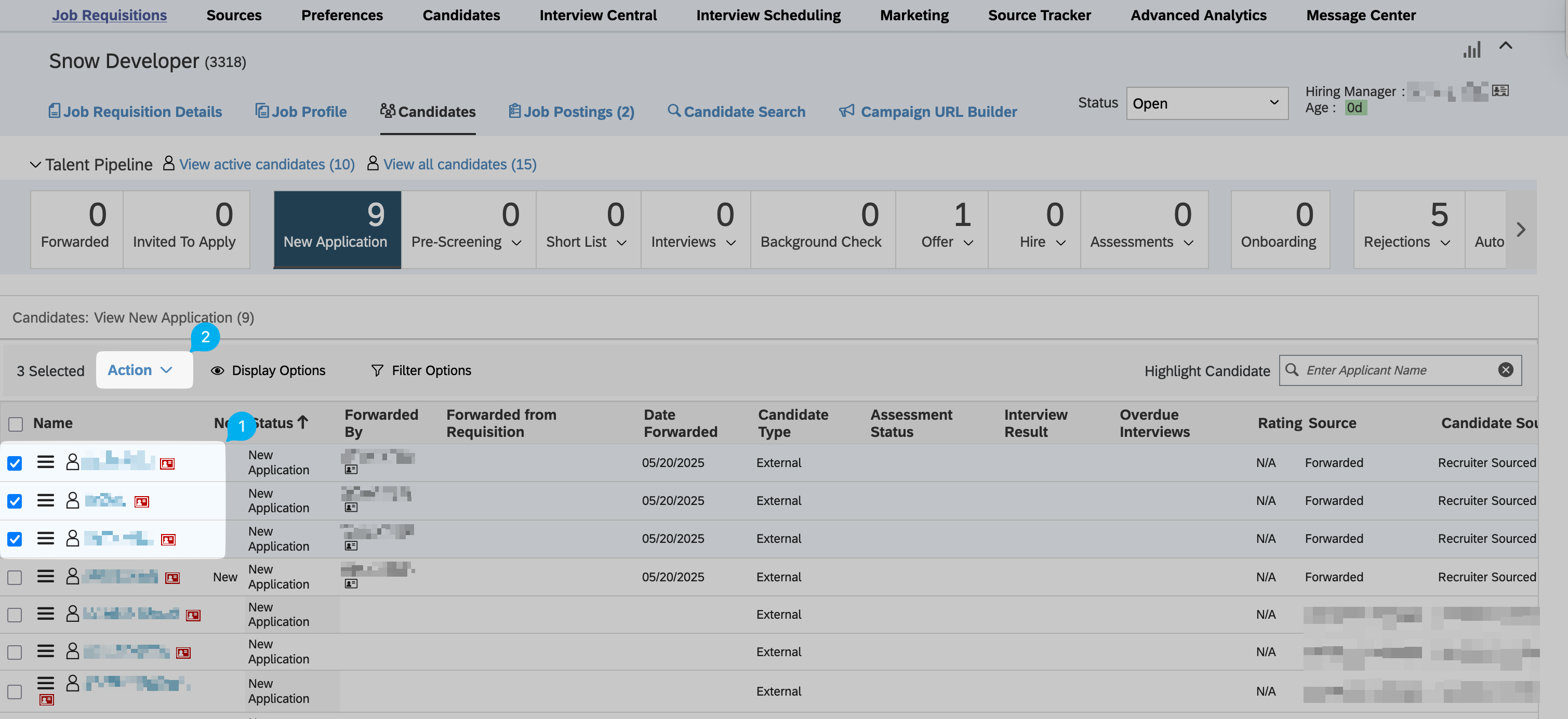 - Go to a job requisition's "Candidates" overview page, and click on select the candidate(s) that you would want to be assessed, and click on "Actions":