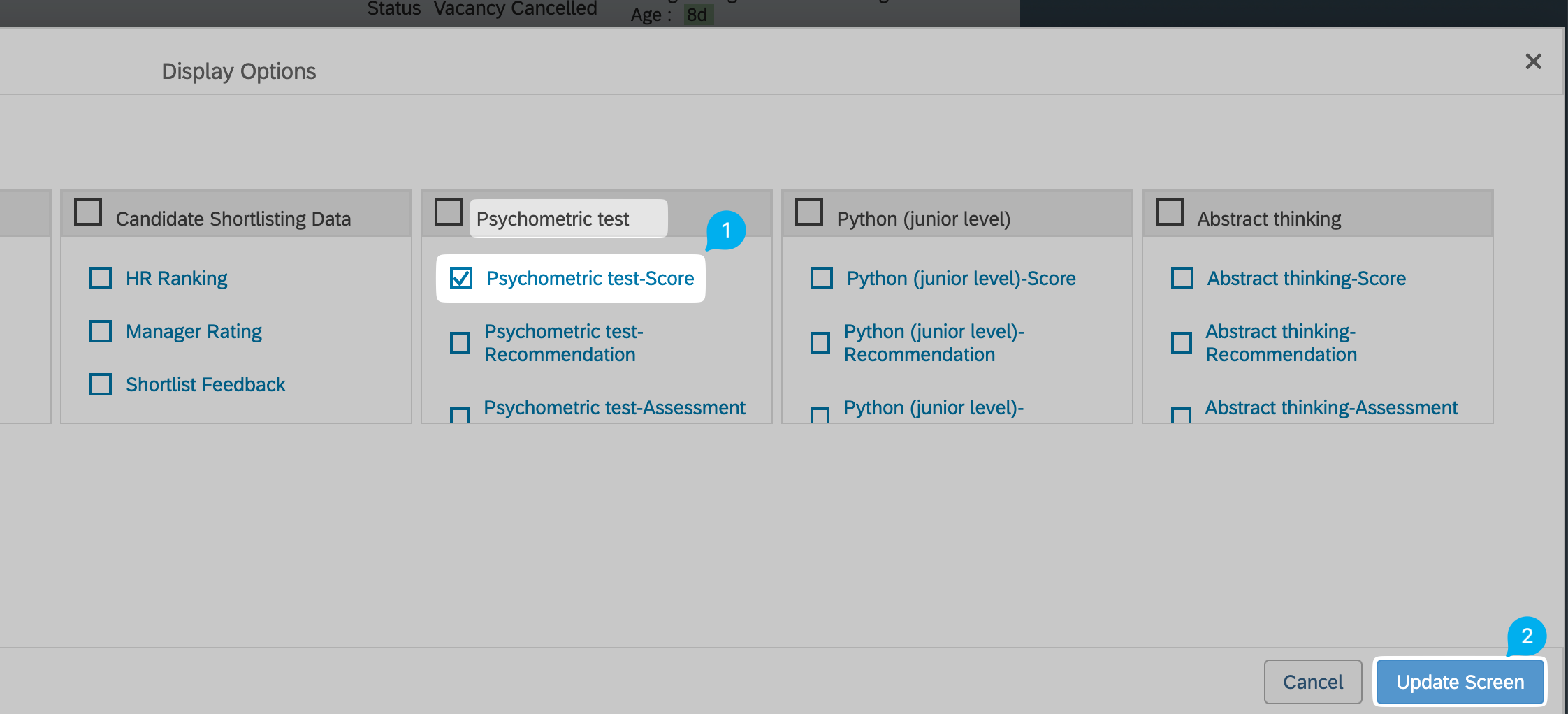 - Select on an assessment test's score option from the popup (we're using "Psychometric test" an example), and click on "Update Screen":