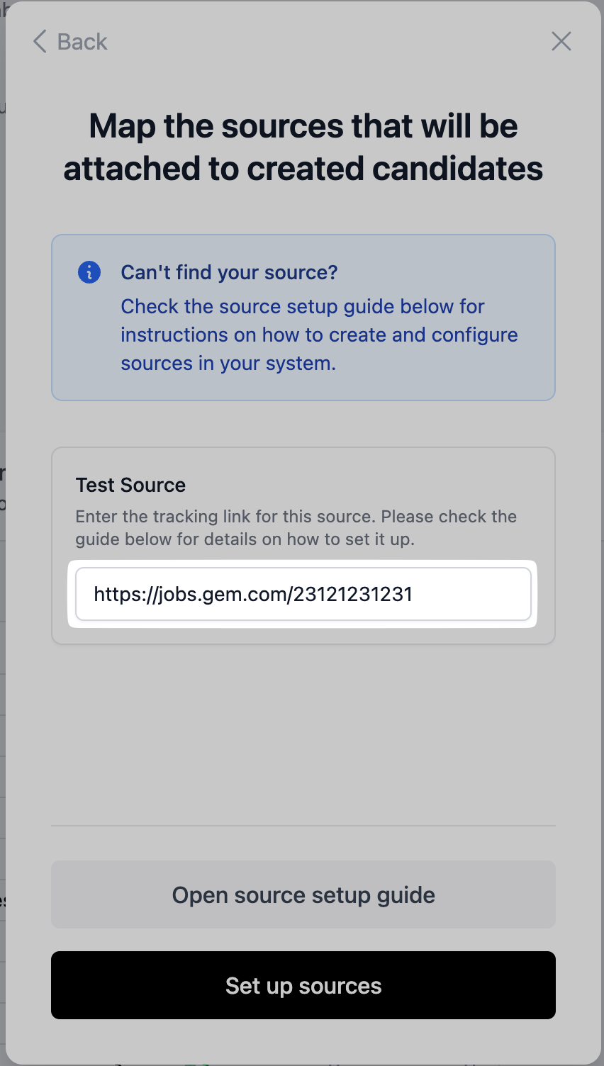 - Go to the Gem ATS tab, click on Applications and expand the Sources list. Then click on New source.