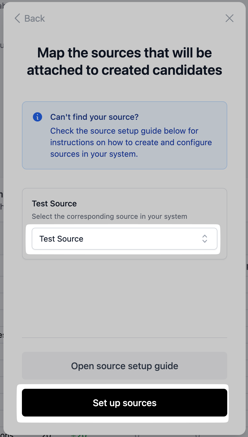 - Select the created source in the setup flow and complete the setup by clicking Set up sources.