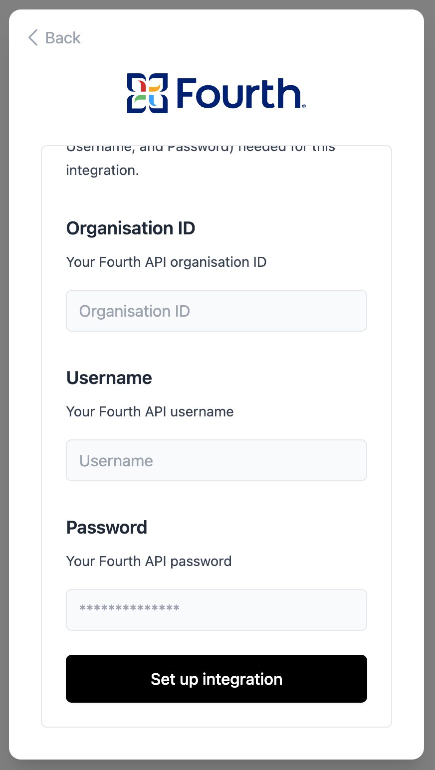 - In the connection flow, paste the Organisation ID, Username, and Password into the corresponding fields to complete setup.