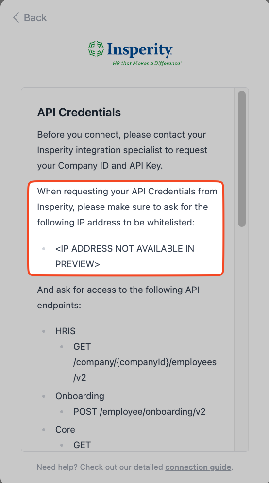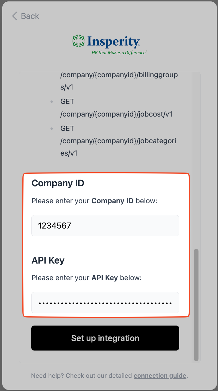 - Reach out to your Insperity support with this information and request your Company ID and API Key