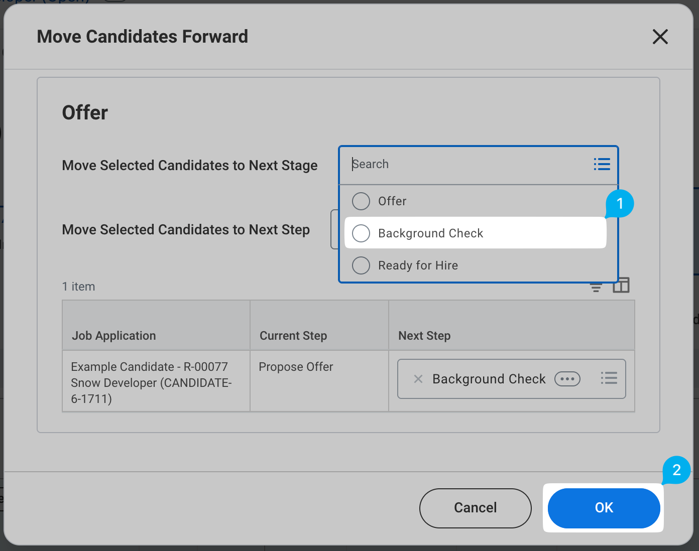 - Select the "Background Check" stage for the "Move Selected Candidates to Next Stage" field and press the "OK" button: