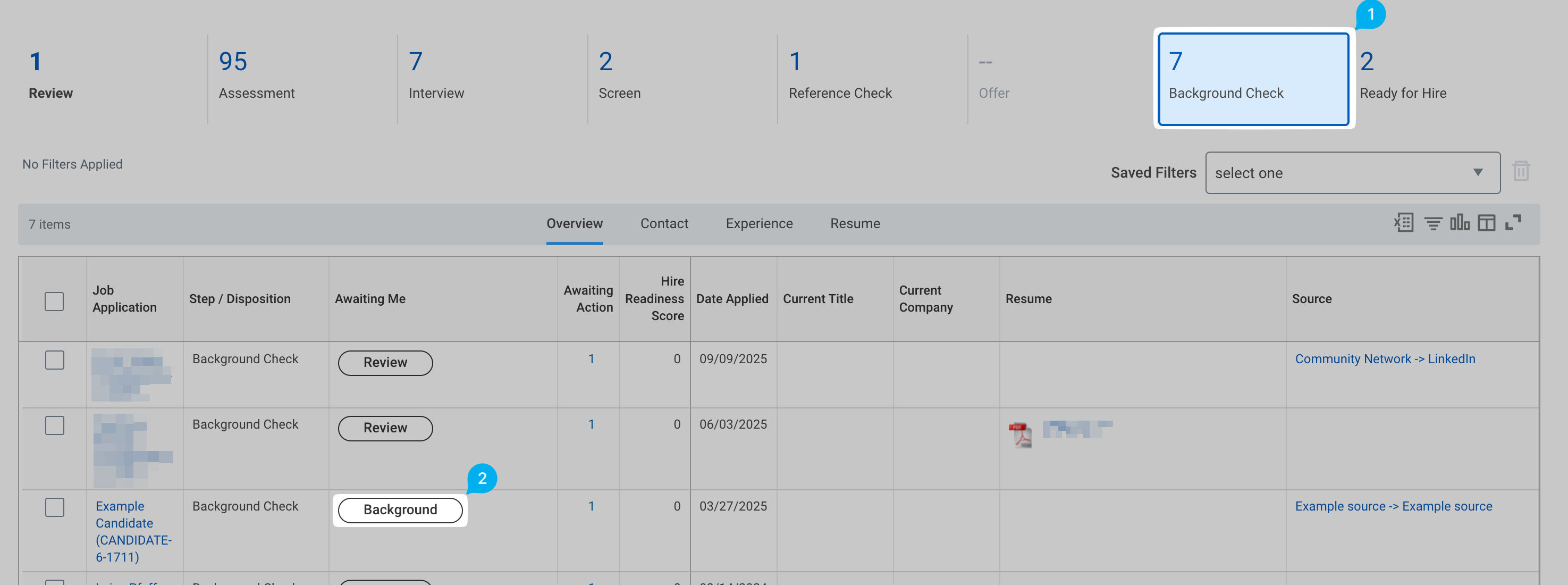 - The candidate will be moved to the "Background" stage. Click on the "Background" stage, locate the candidate, and click on the "Background" button:
