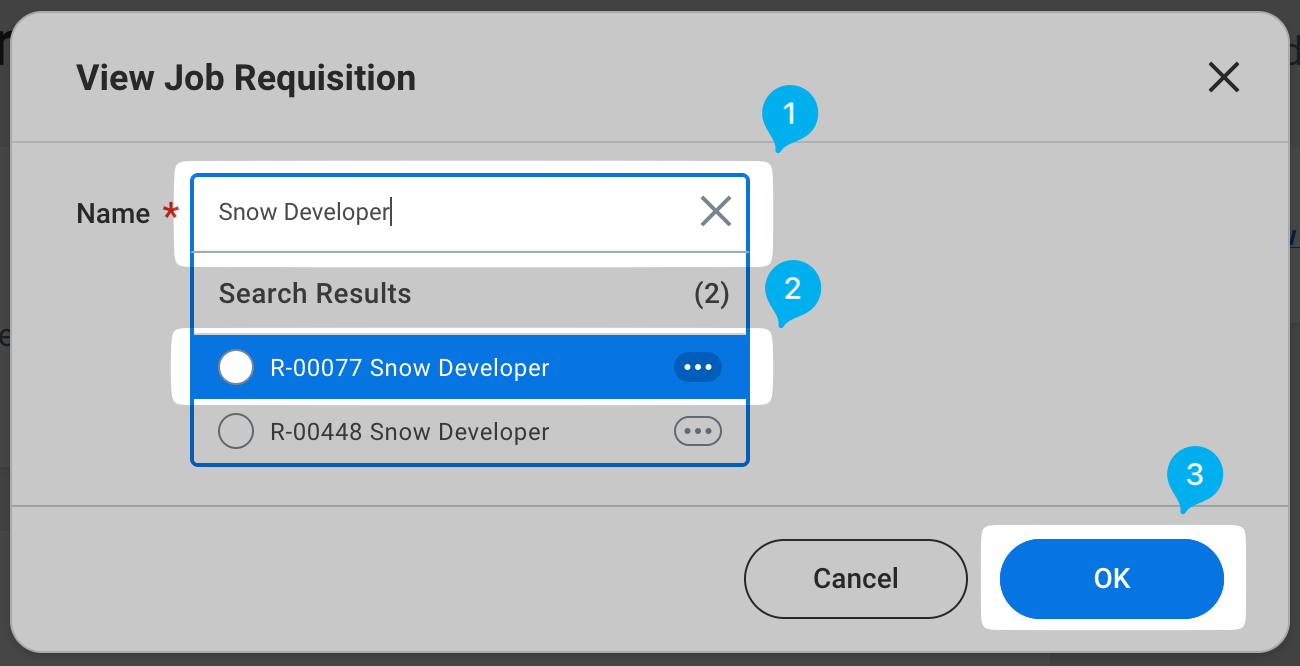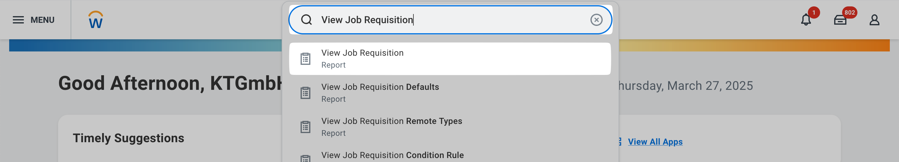 - Log into your Workday instance, search for "View Job Requisition" and click the entry in the dropdown: