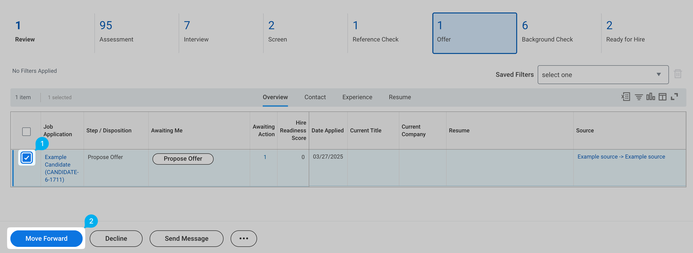 - Select a candidate (we're selecting the "Example Candidate" candidate in this example), and click the "Move Forward" button: