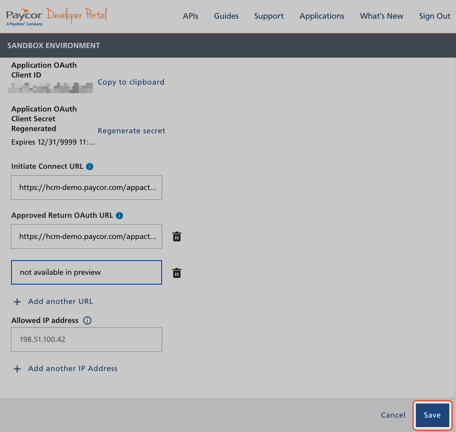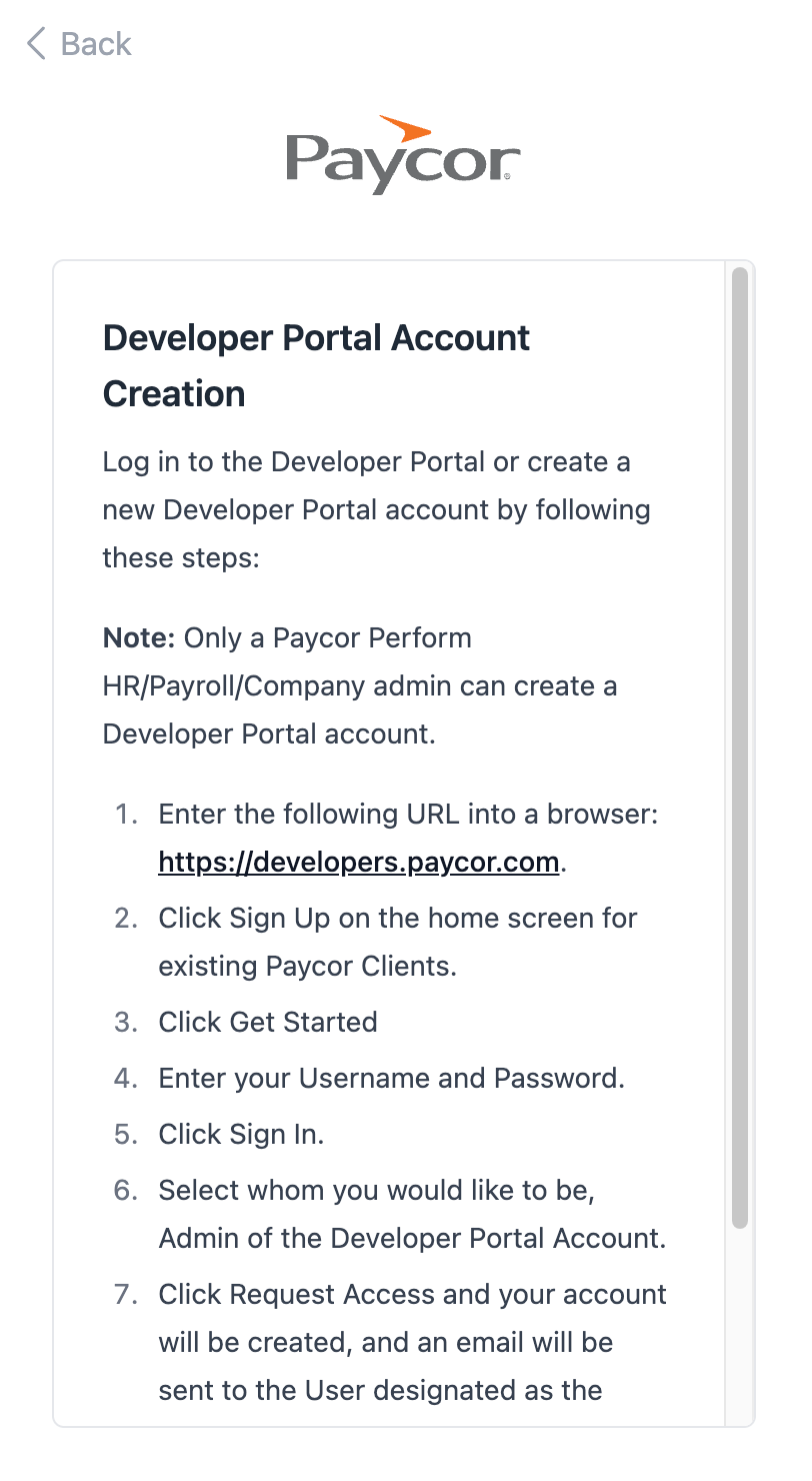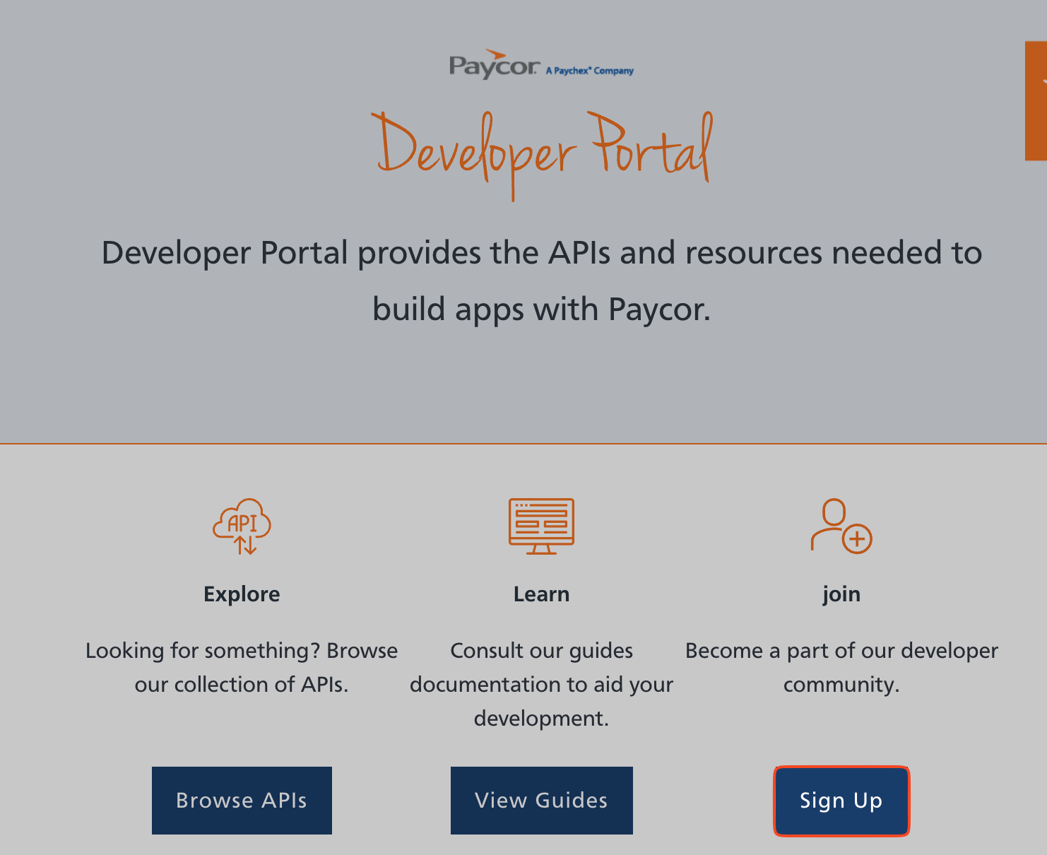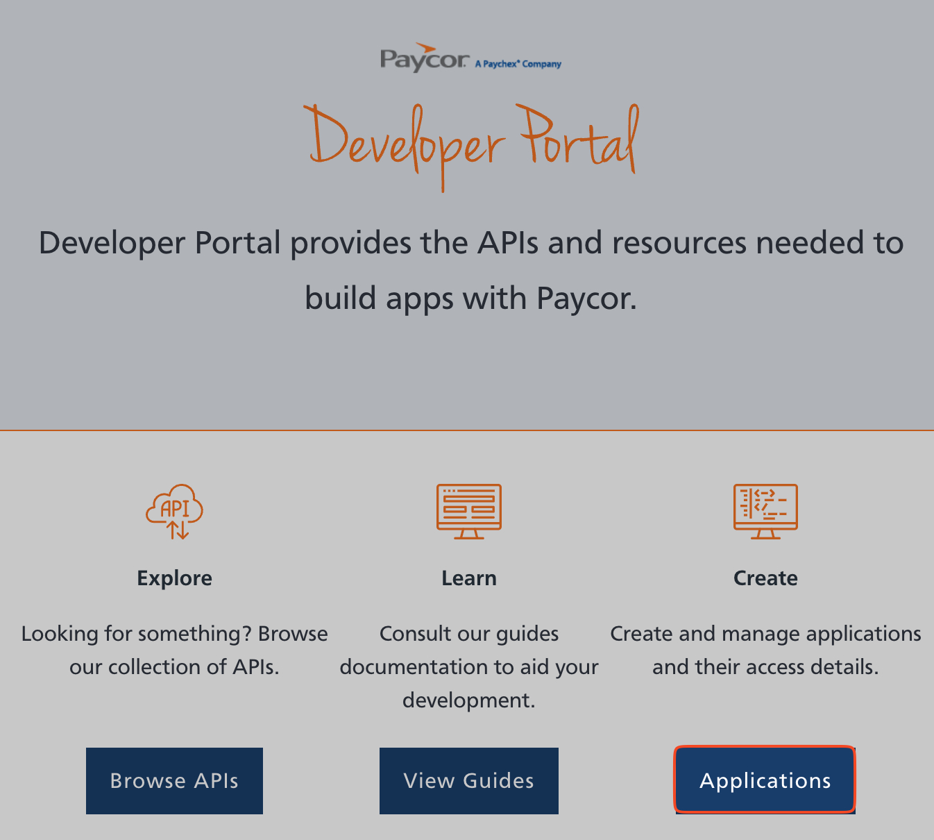 - Enter the following URL into a browser: developers.paycor.com (developers-sandbox.paycor.com if you are connecting a sandbox)