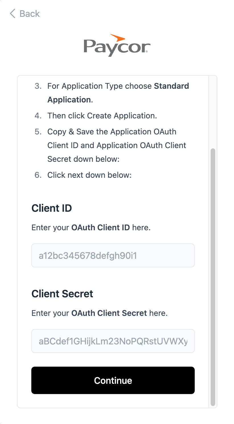 - Enter the Client ID and Client Secret in the connection flow and click continue: