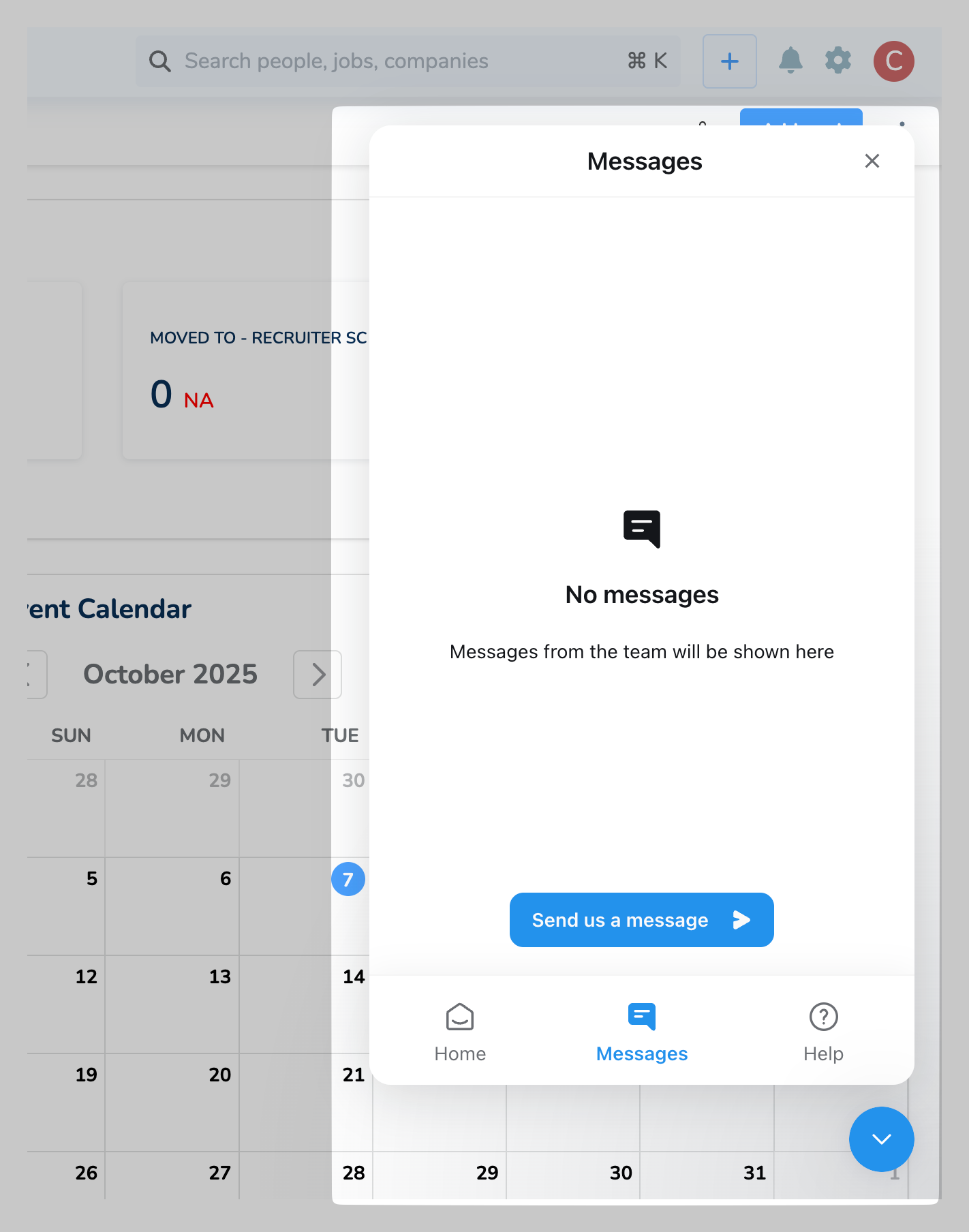 Log in to RecruiterFlow, then request your API key from their support by opening the chat window in the bottom right and starting a new conversation with them: