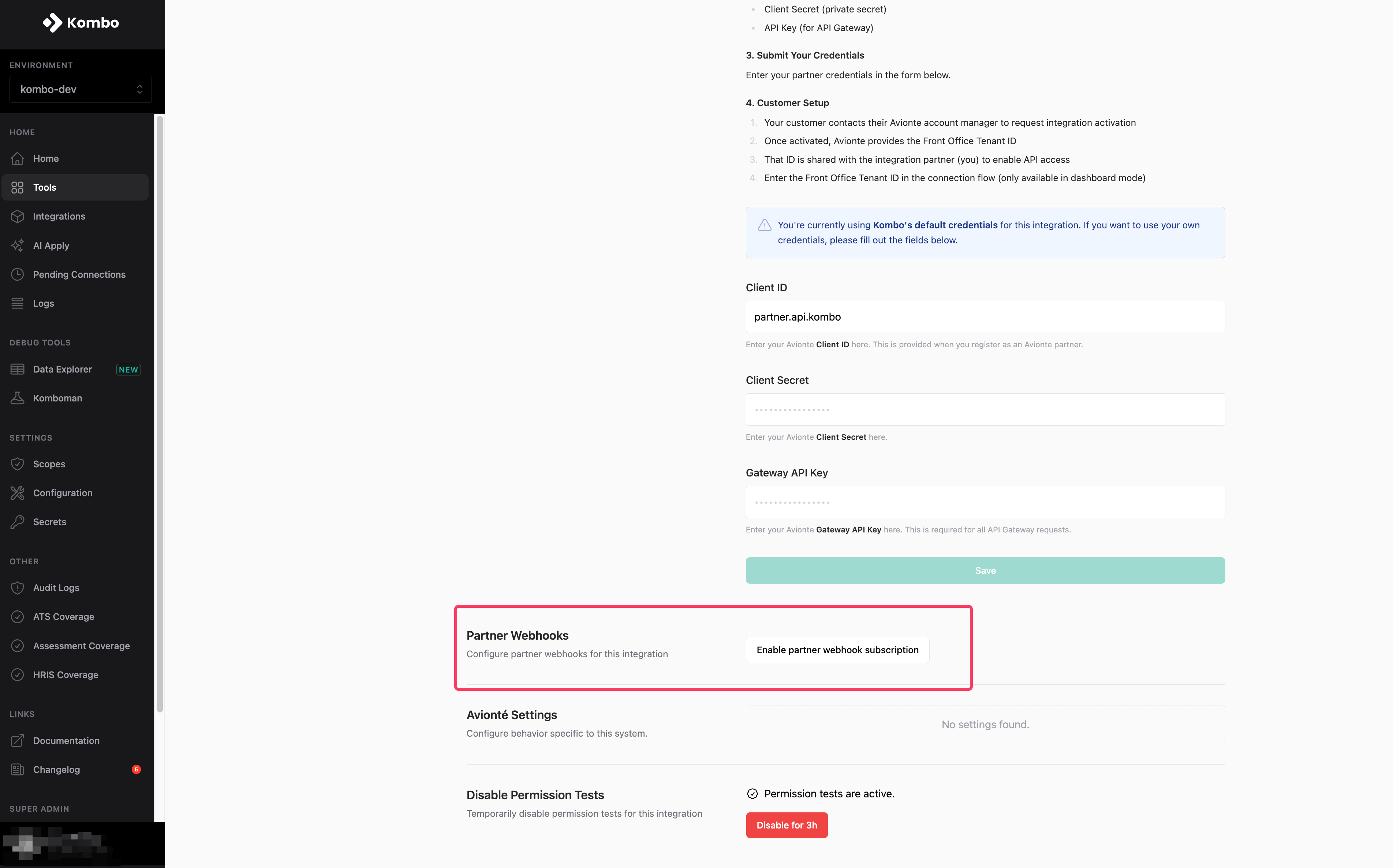⚠️ IMPORTANT: After you have set up the partner webhooks please contact Kombo (support or your CS representative). We have to send the authentication to Avionté. Before this step the webhooks will not work!