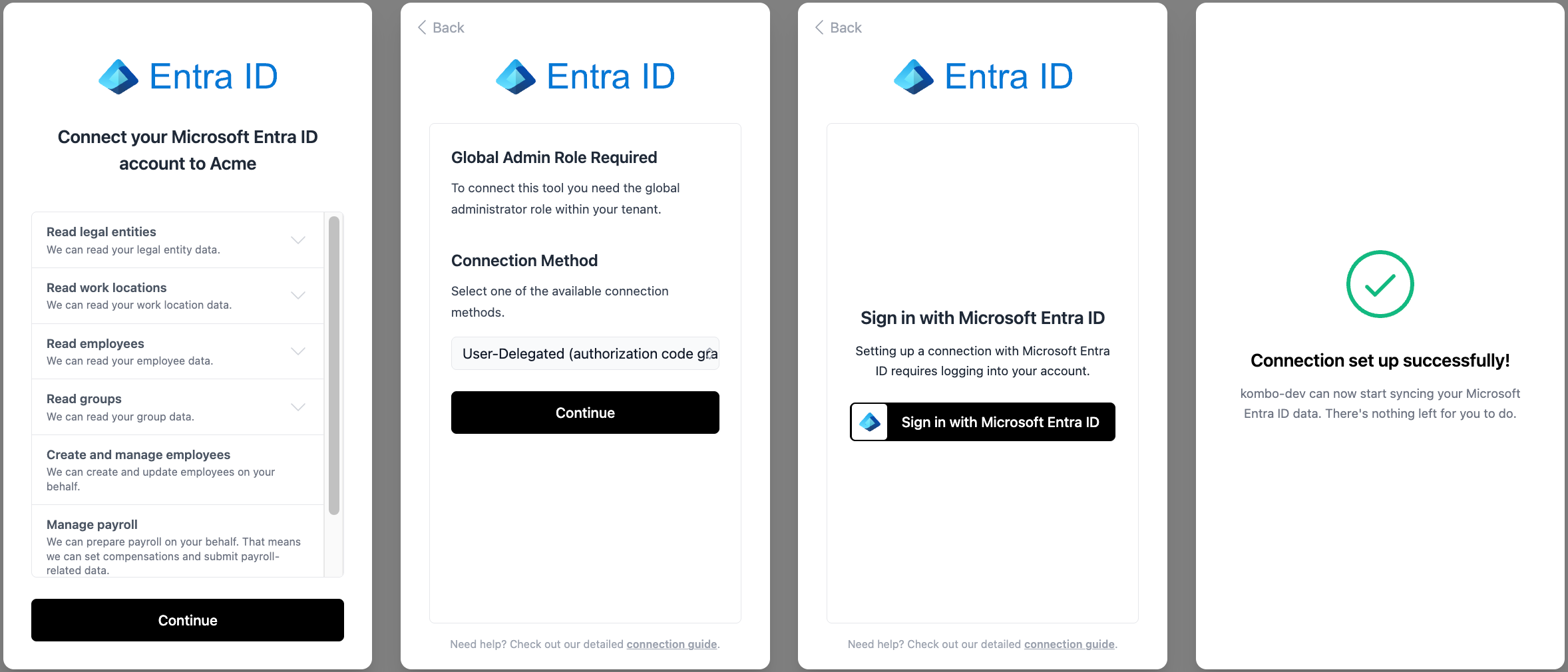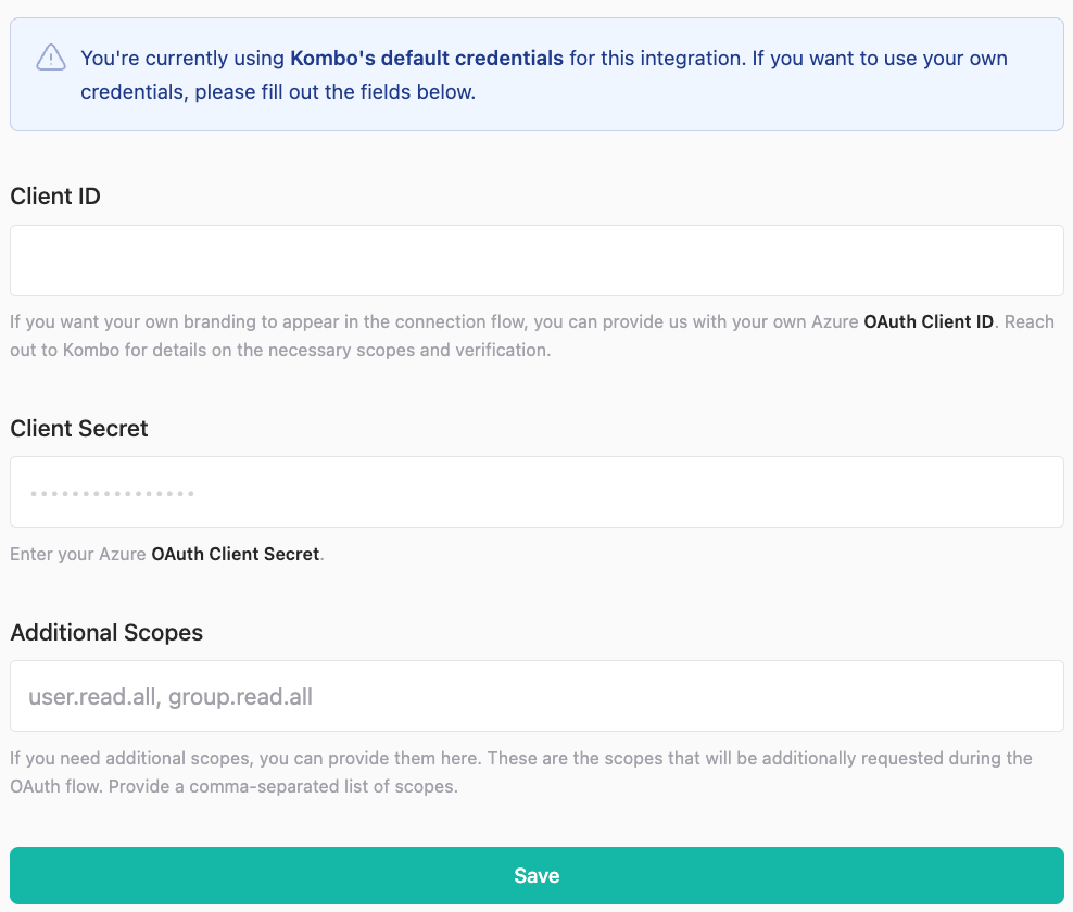 Additionally, you can replace the Kombo App that will show up in your customers Entra ID by providing us with your own Partner Credentials (note: these will only be used for the User-Delegated access flow):