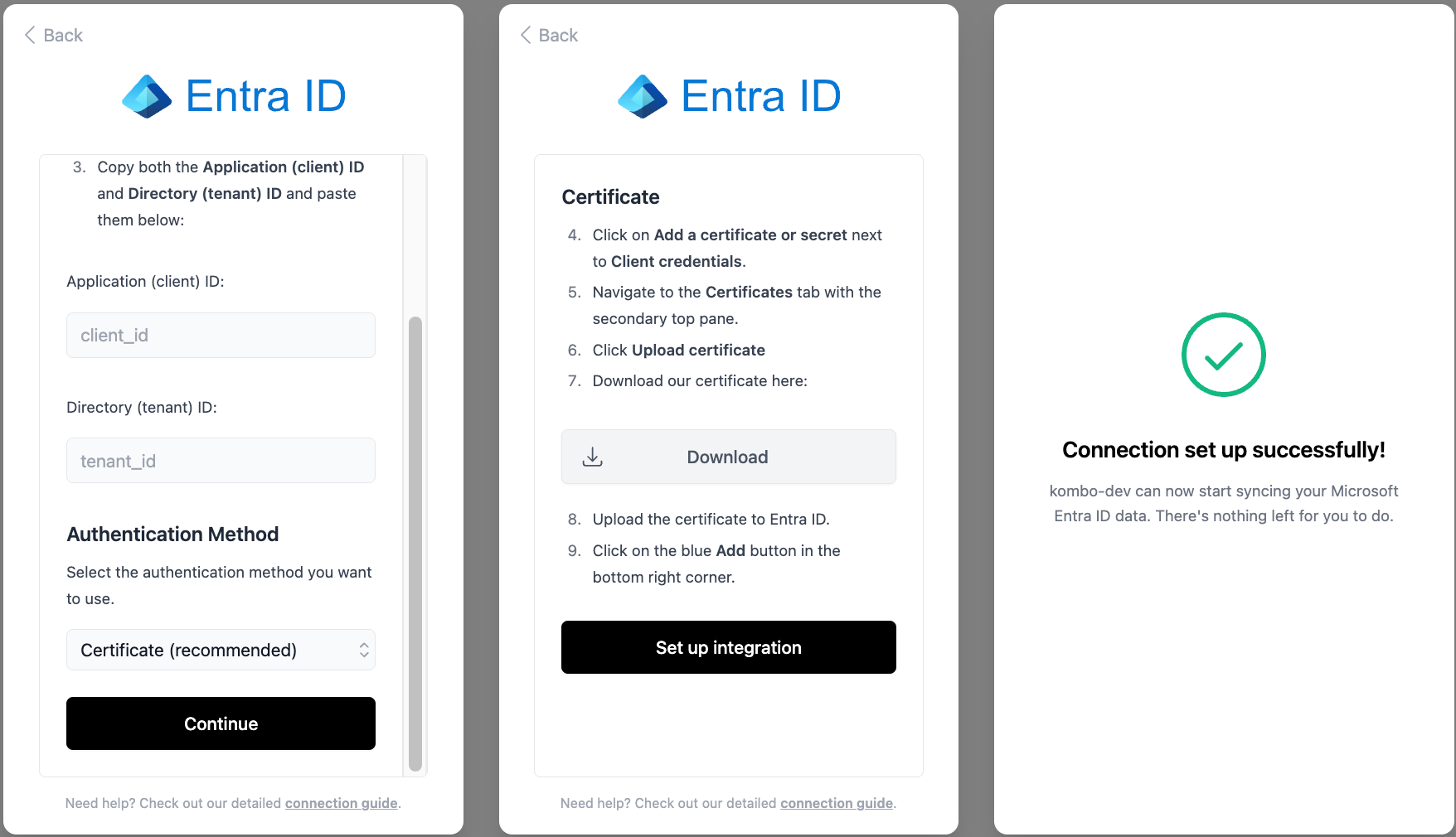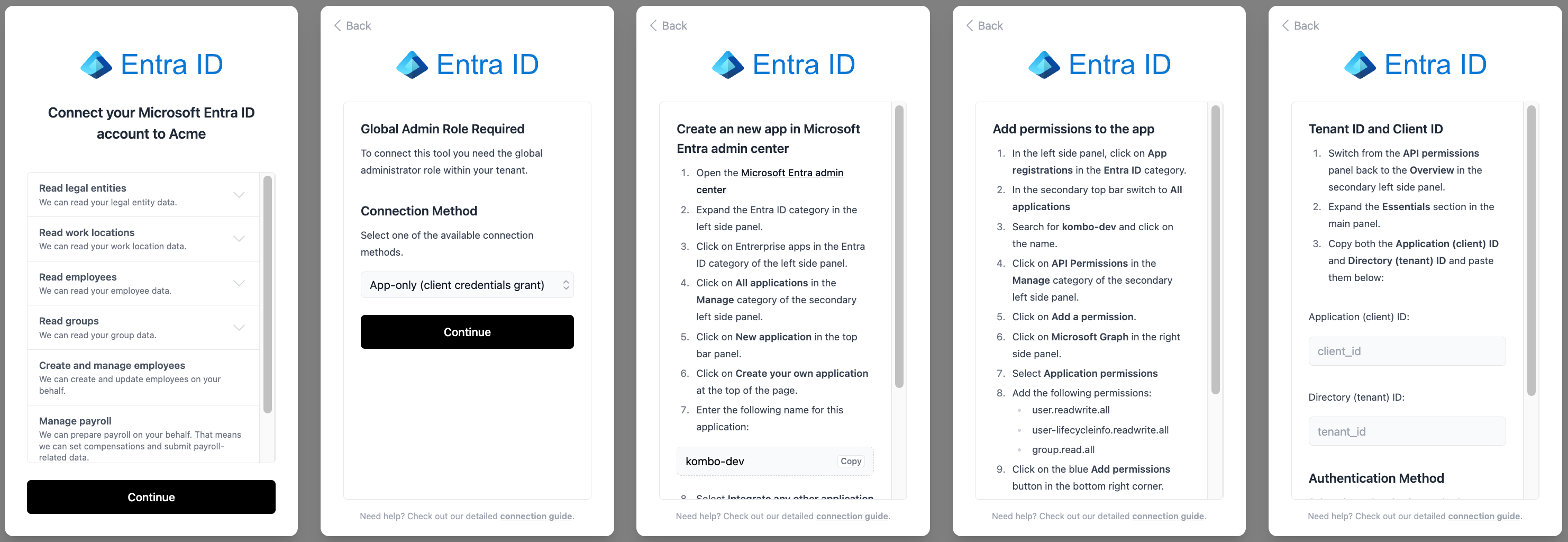 This help center article is supposed to give our customers guidance on the selection of available authentication flows for Kombo's Azure AD/Entra ID integration. Please note that the configuration for both Azure AD and Entra ID are configured separately on the tools page, so if you have both enabled remember to change your settings for both.