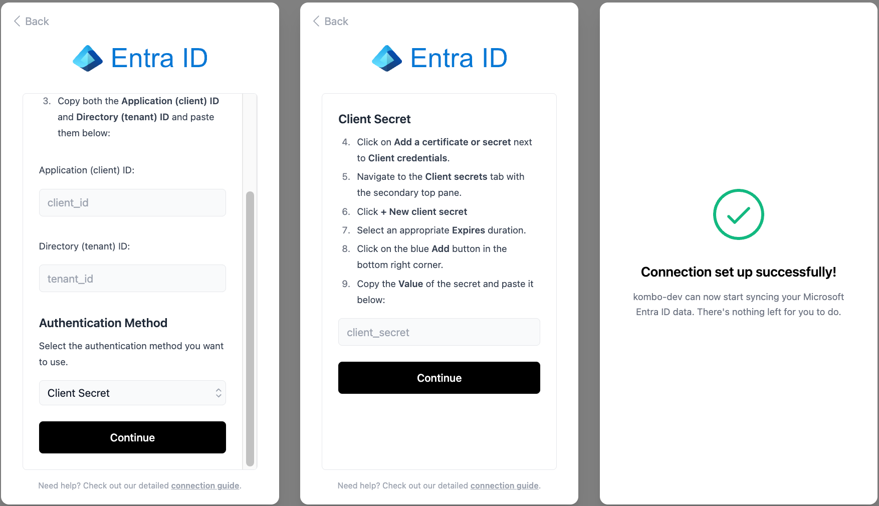 During this connection flow each of your customers set's up the Entra ID App manually and provides authentication credentials. Please note that the client secret will automatically expire, requiring re-authentication (your customer can generate a new secret and skip most of the inital setup steps in this flow). Entra ID allows secrets to be valid for up to 24 Months. The Entra ID UI recommends 6 months.