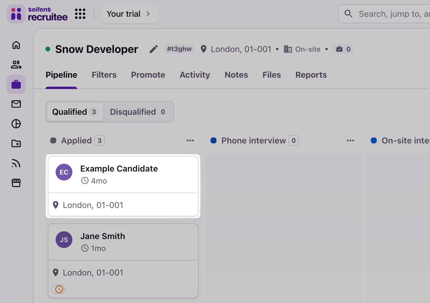Select a specific candidate from a job's details page (you can also select a candidate from the "Candidates" page as well):