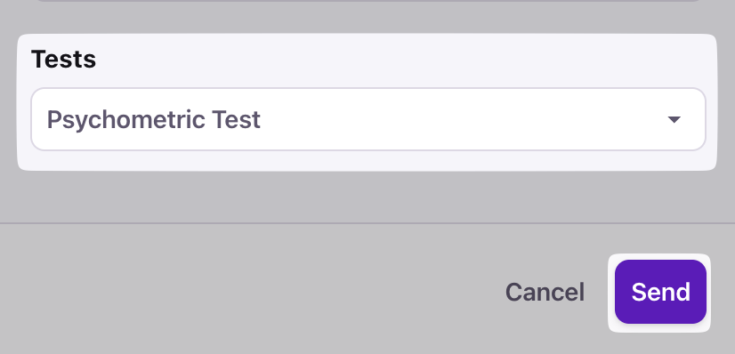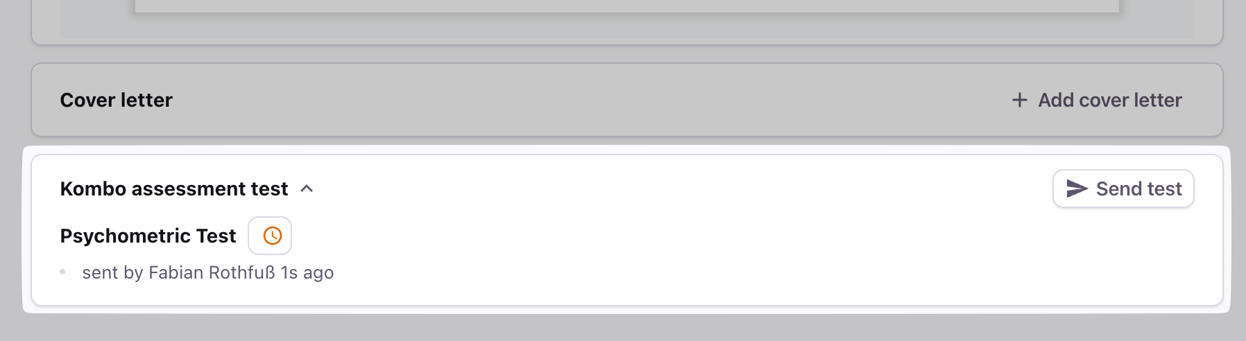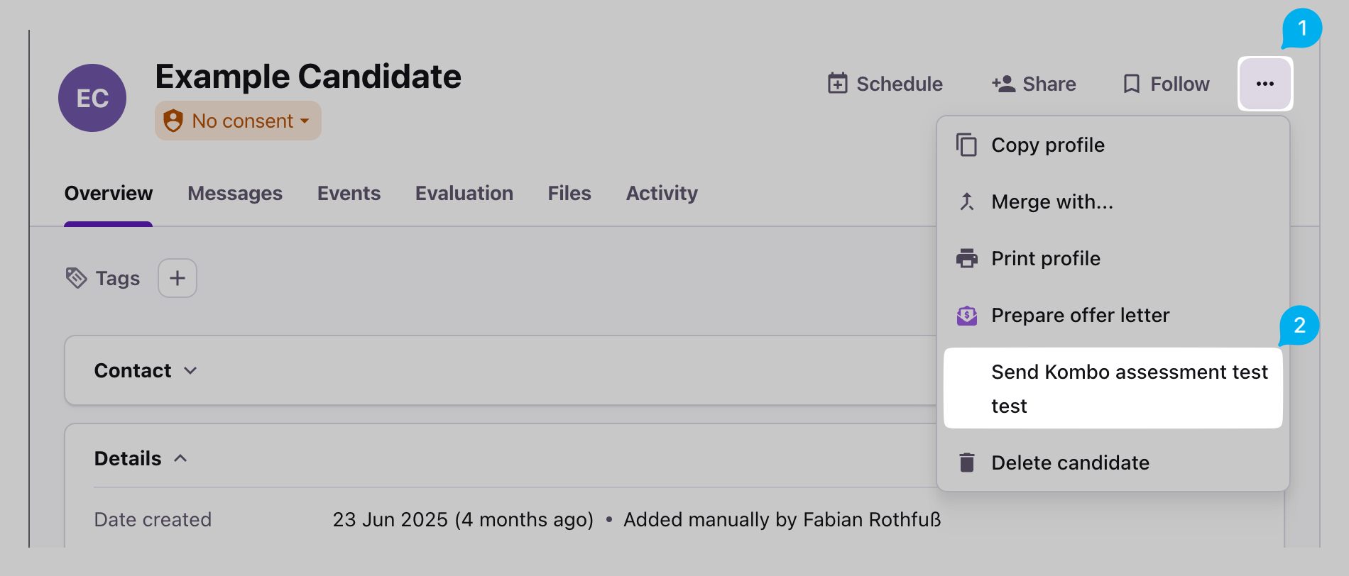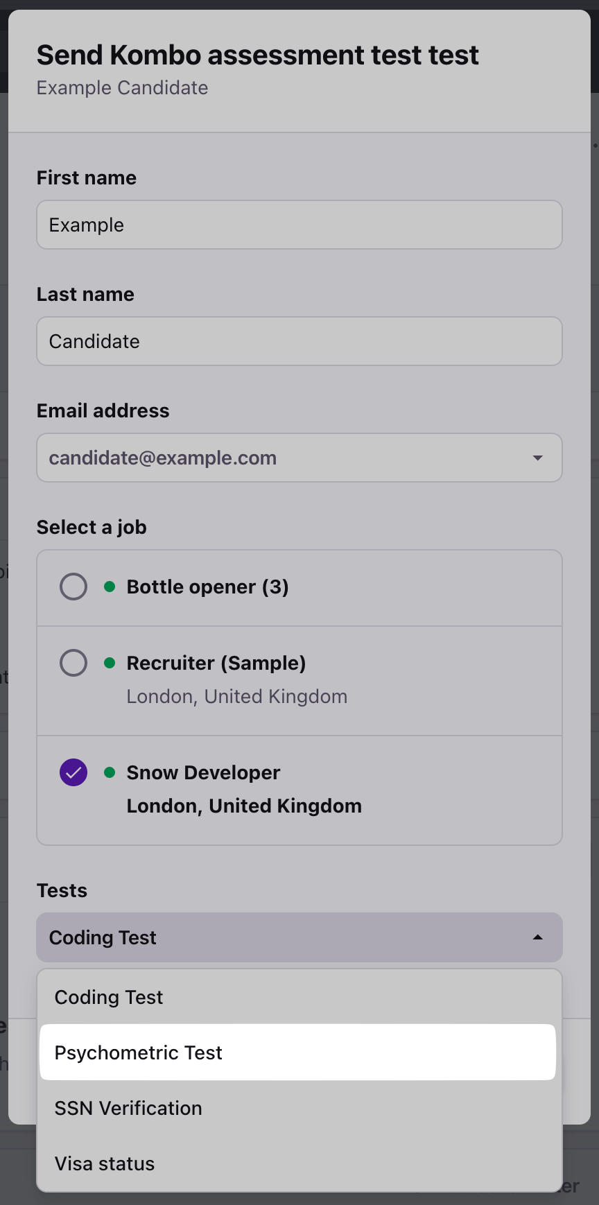 - Click on the "Ellipsis" button next to the candidate's name, and click on the "Send <Your Assessment Vendor>" from the dropdown (We're using "Kombo" in this example):