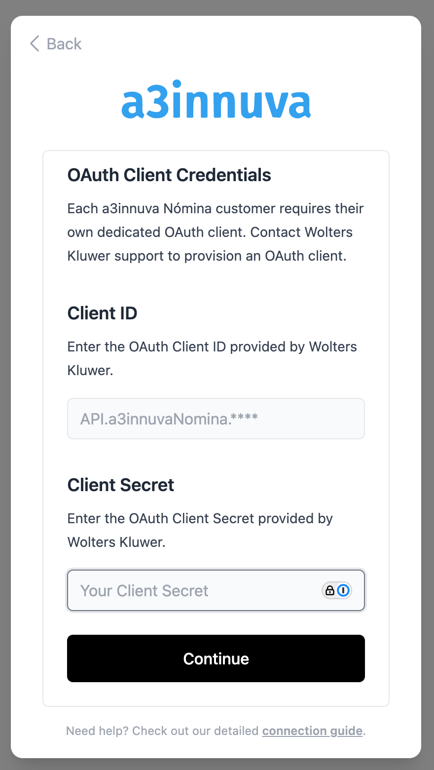 Once you received the client_id and client_secret, you can proceed to the connection flow and fill it.