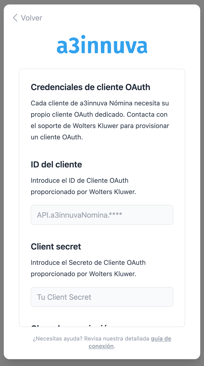 Antes de empezar, complete este formulario de a3innuva para recibir su client_id y client_secret. Por favor, seleccione las siguientes respuestas: