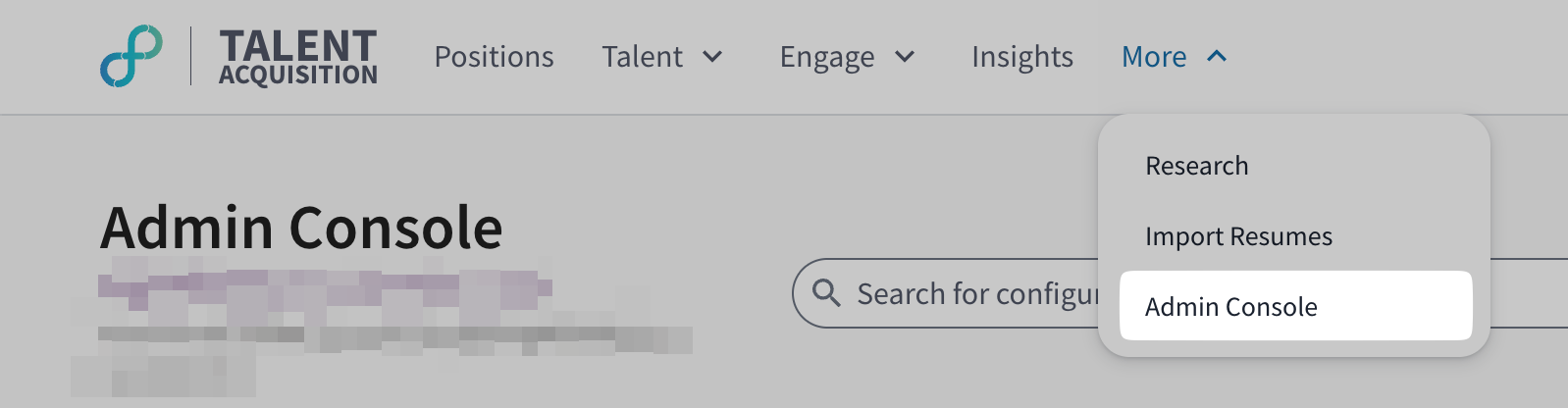 - Log in to your Eightfold instance, click on "More" on the navigation bar, and select "Admin Console" from the dropdown: