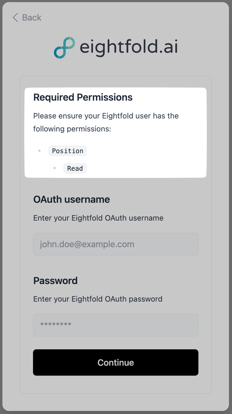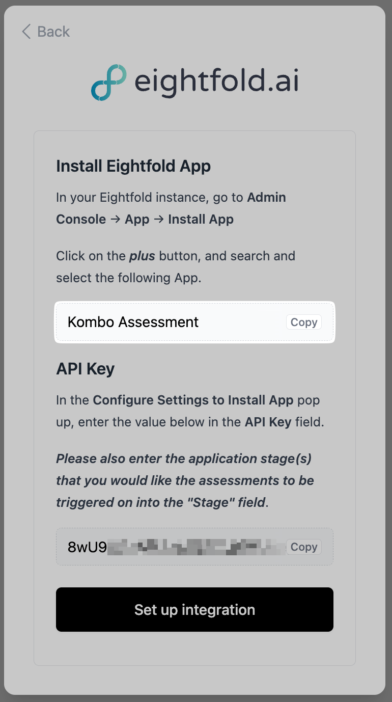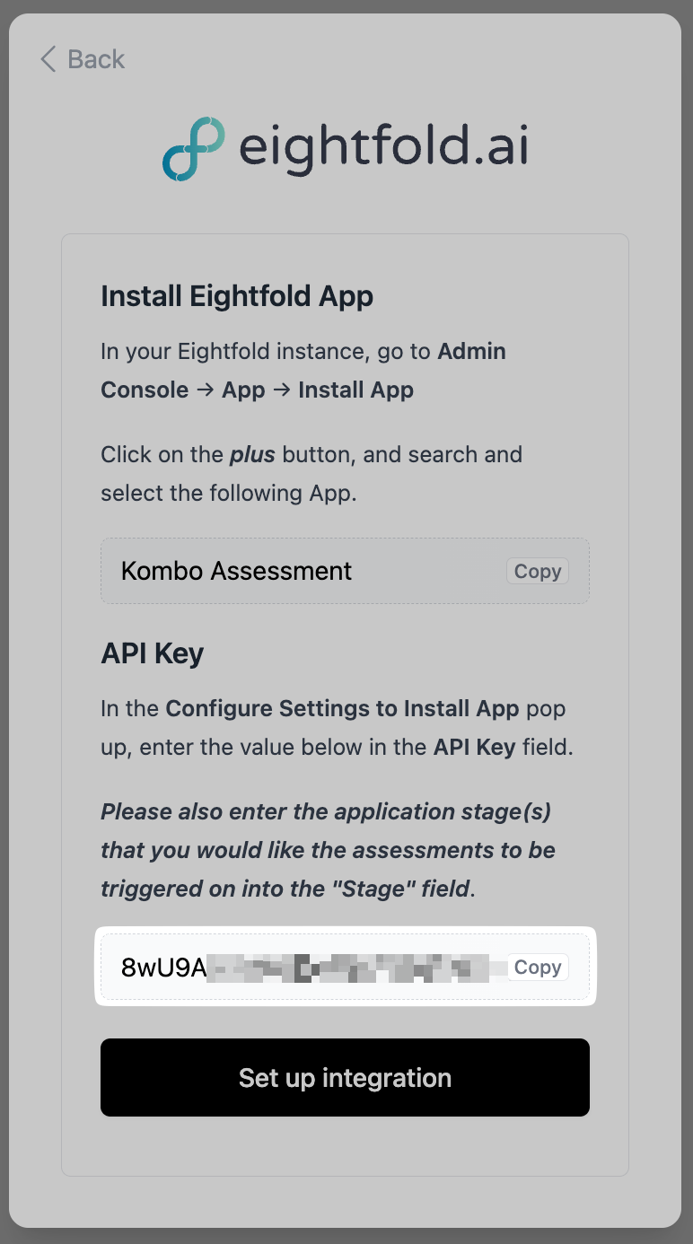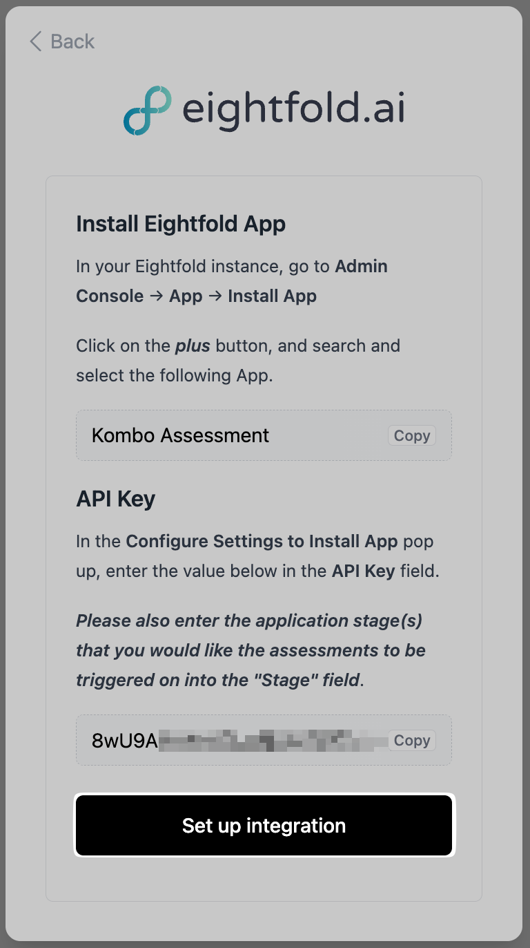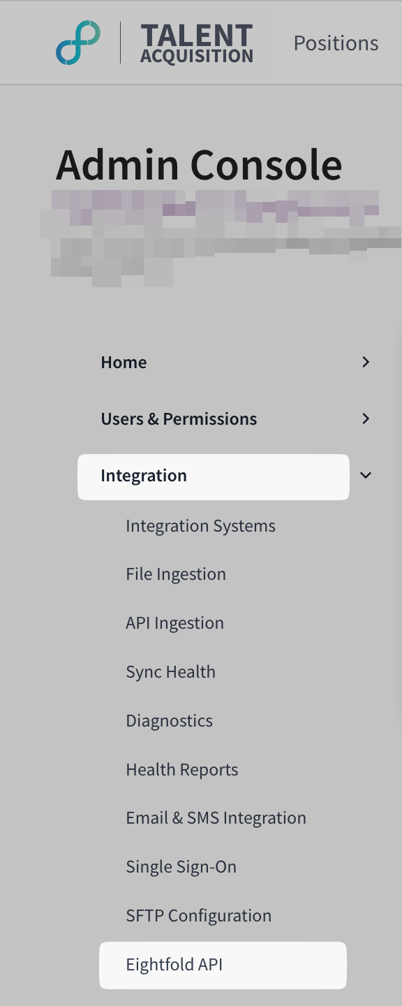 - Click on the "Integration" tab on the sidebar, then click on the "Eightfold API" tab from the dropdown: