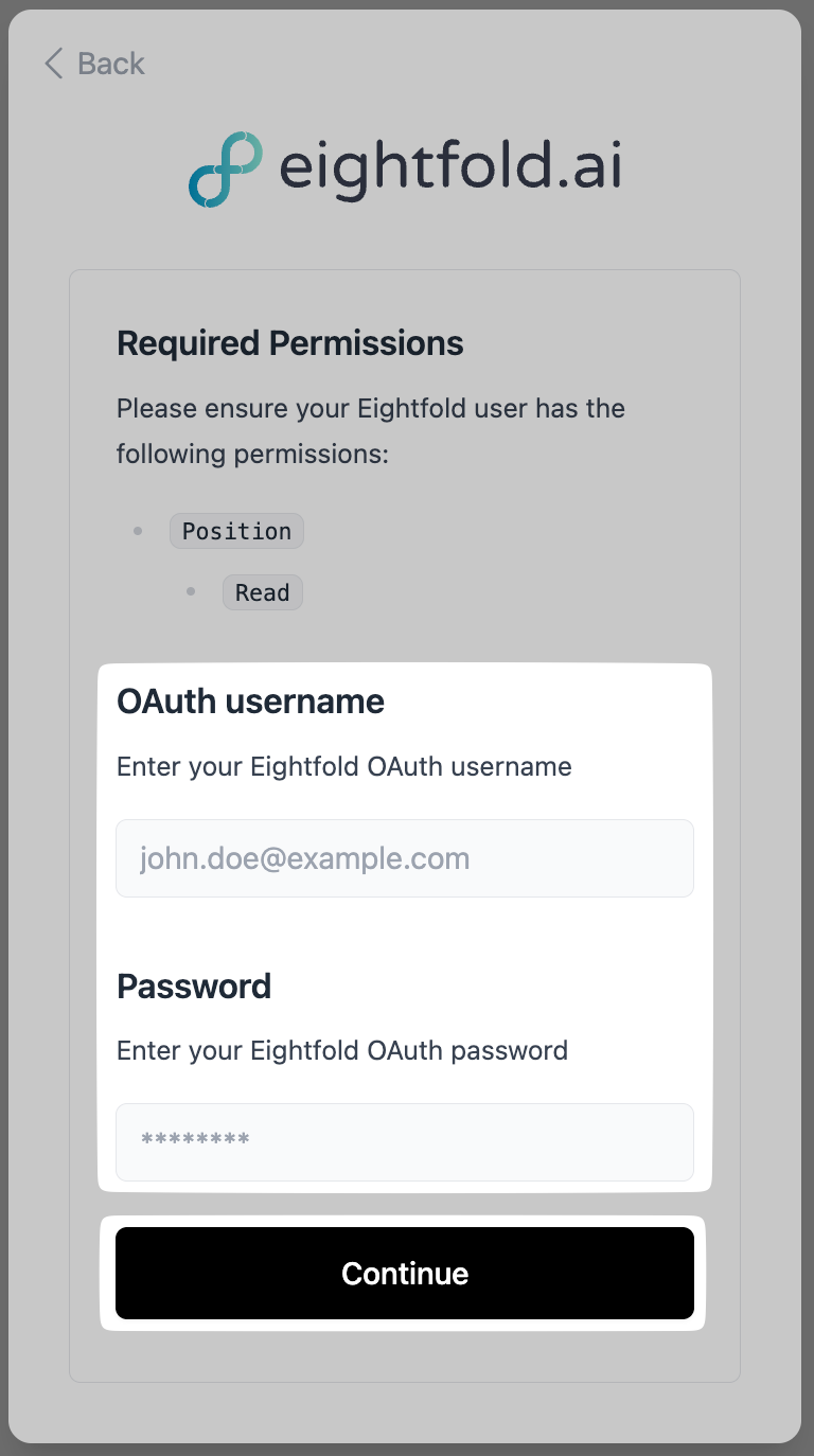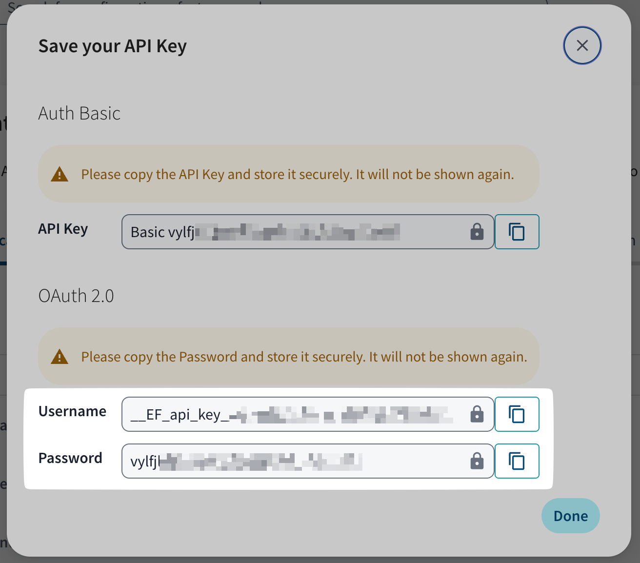 - Copy the "Username" and "Password" from the pop-up, paste them into the connection flow, and press "Continue":
