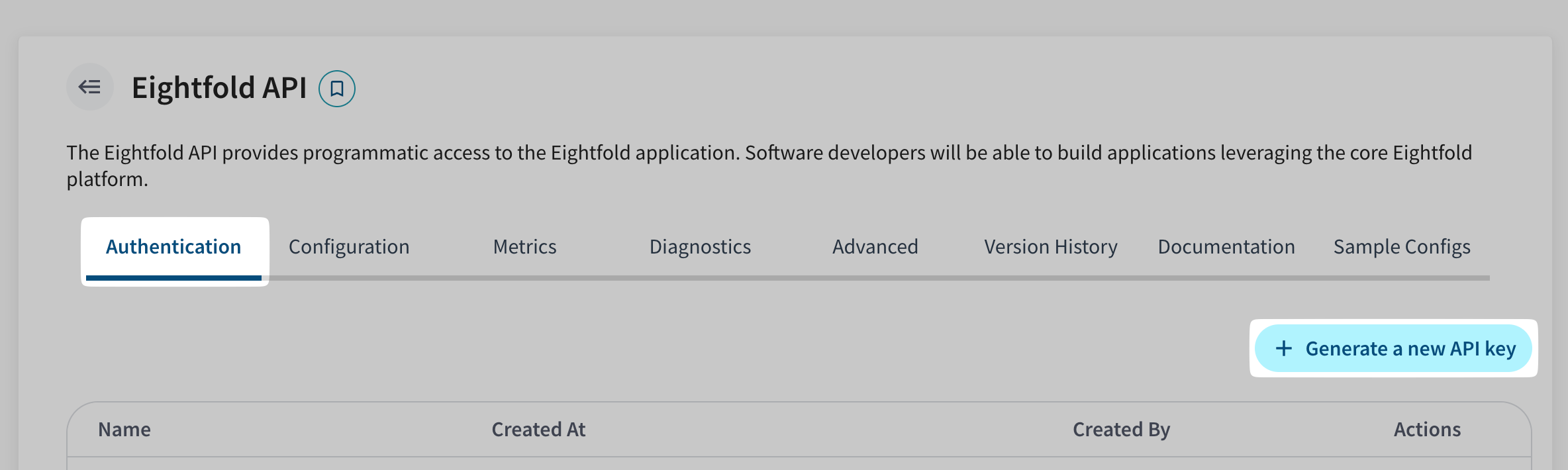 - Under the "Authentication" tab of the "Eightfold API" page, click on the "Generate a new API key" button: