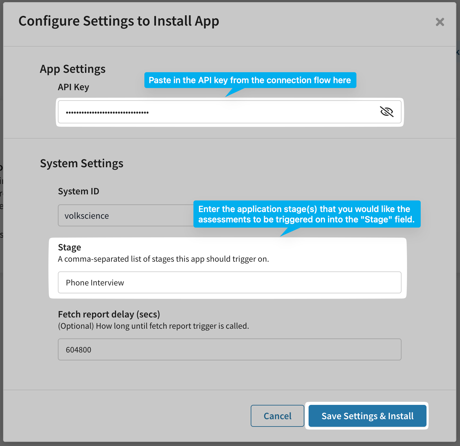 - Copy the generated API key from the connection flow, and paste it into the "Configure Settings to Install App" pop-up":