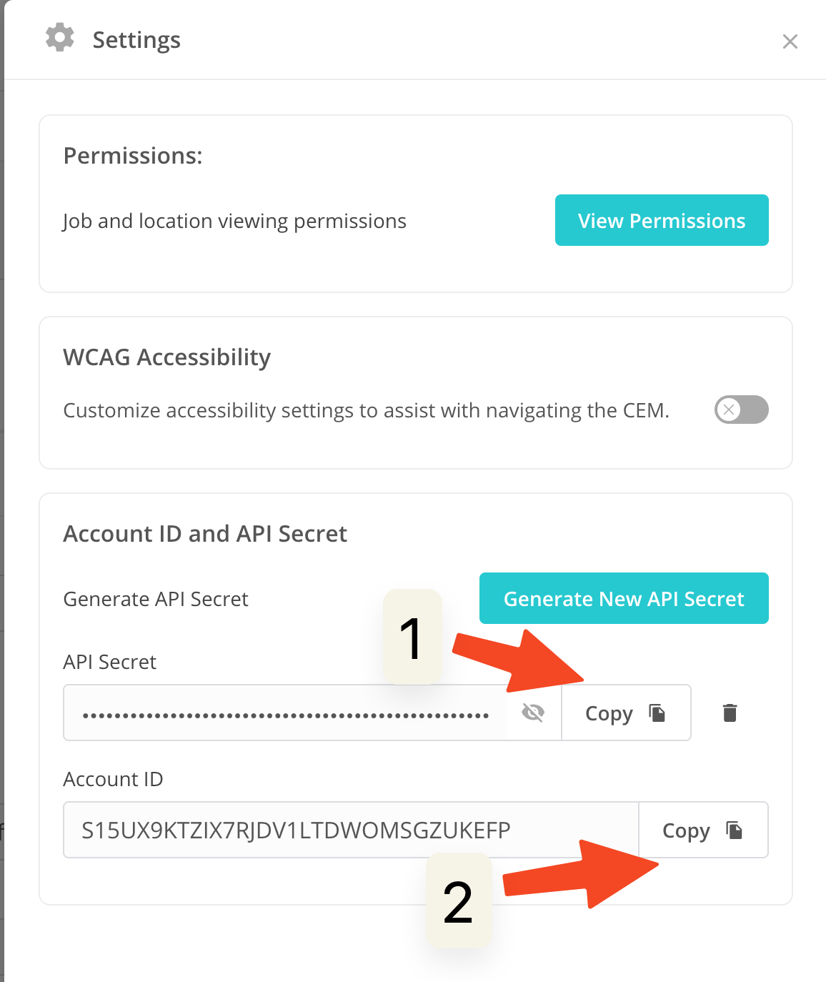 3. A new settings window pops up. Copy the "Account ID" and the "API Secret"