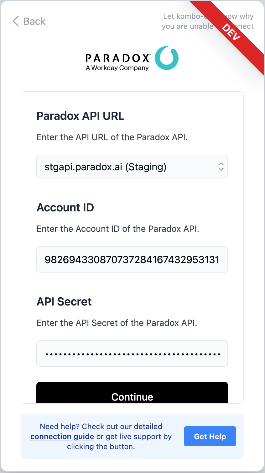 2. Enter the Account ID and Client Secret you obtained in Paradox. Also select the API url. For production instances this is usually api.paradox.ai or api.eu1.paradox.ai