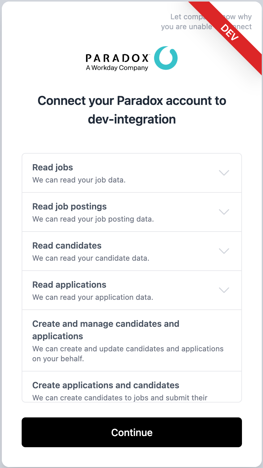 - Click the connection link you have been provided. You will see a screen with the requested scopes.