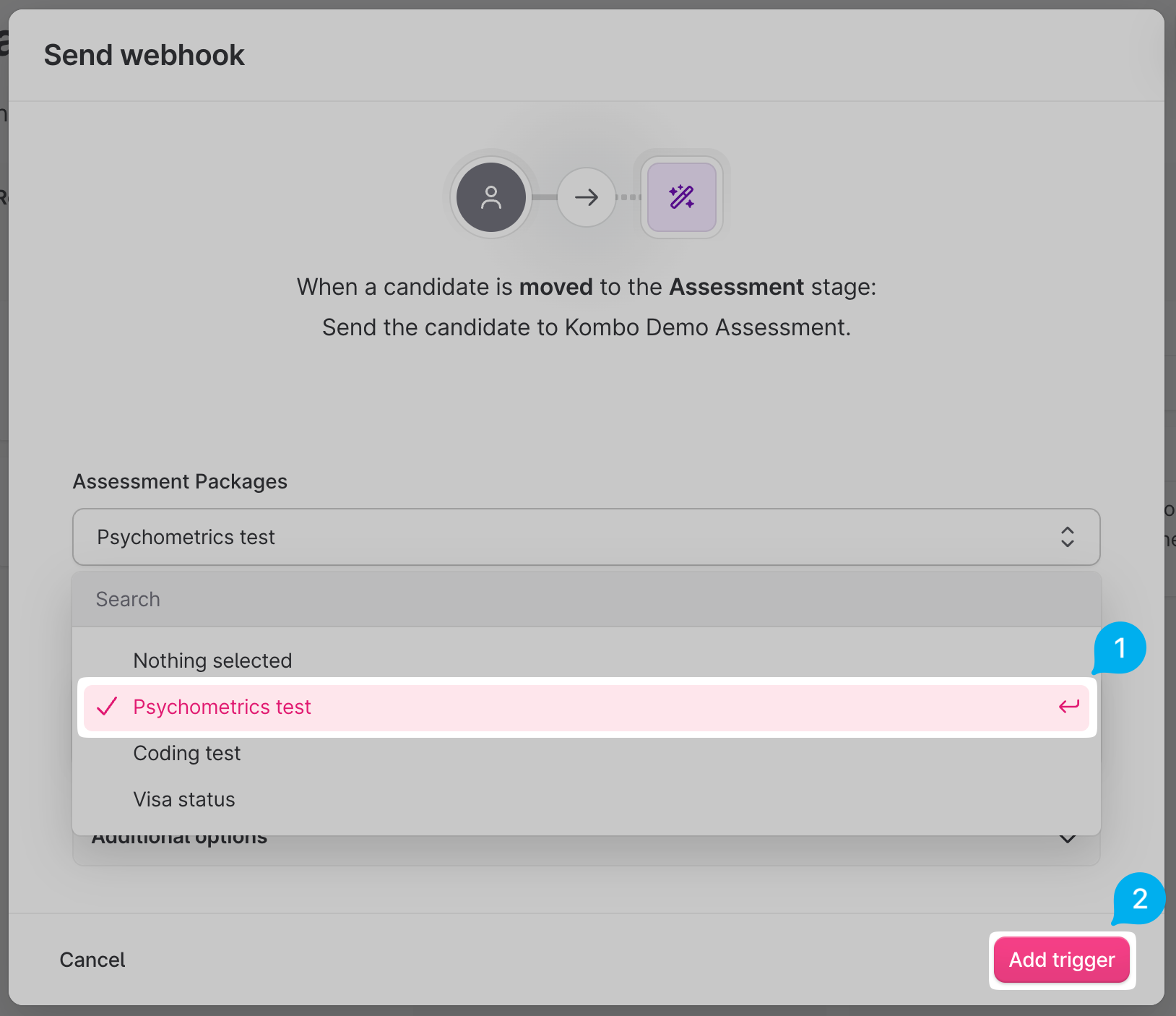 - In the pop-up, select an assessment test that you would like the candidates to be automatically assessed on when they move to the assessment stage from the "Assessment Packages" dropdown, and click "Add Trigger":