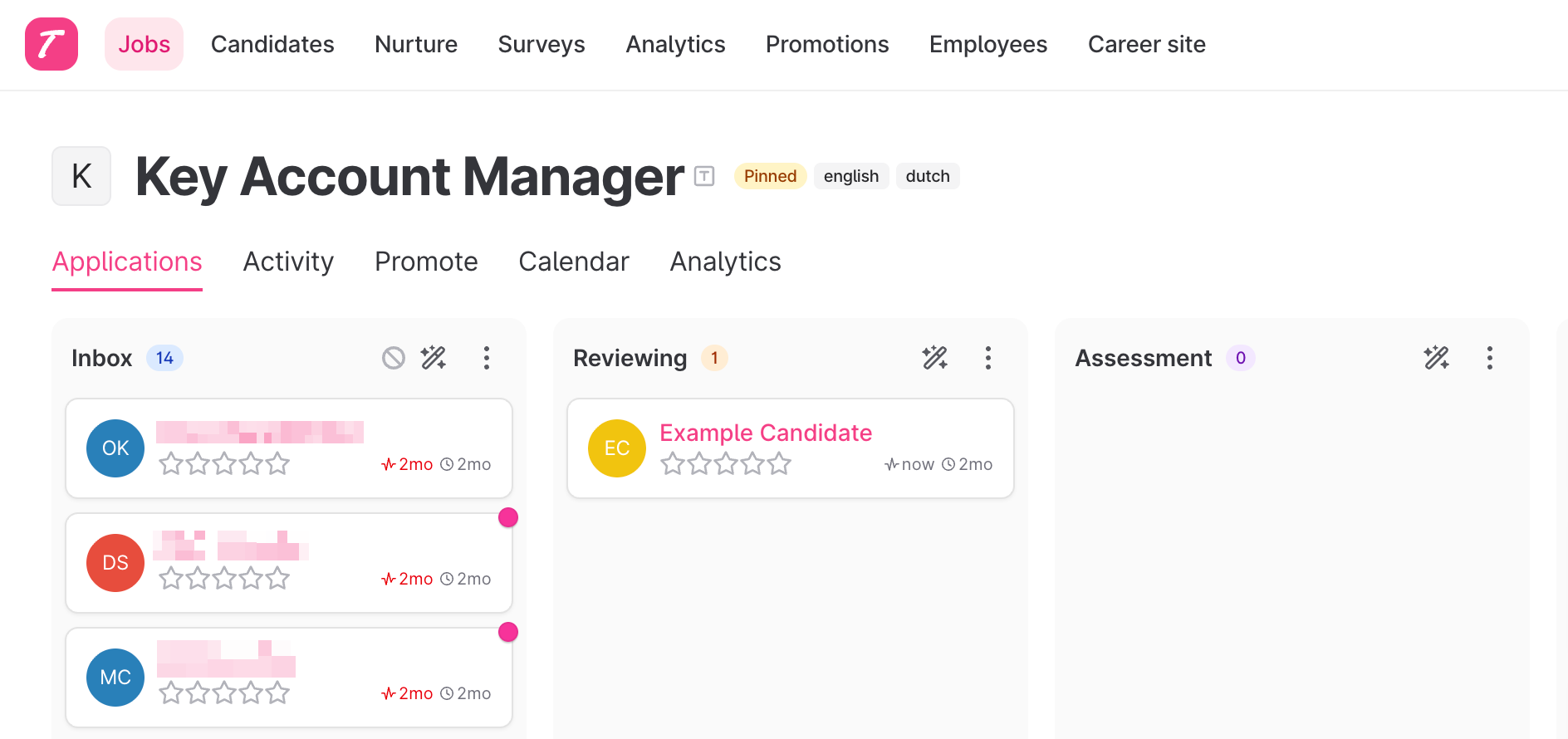 - Go to the "Jobs" page, and select a job where you want to assess the candidates (we are using the "Key Account Manager" job as an example in this guide):