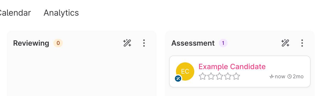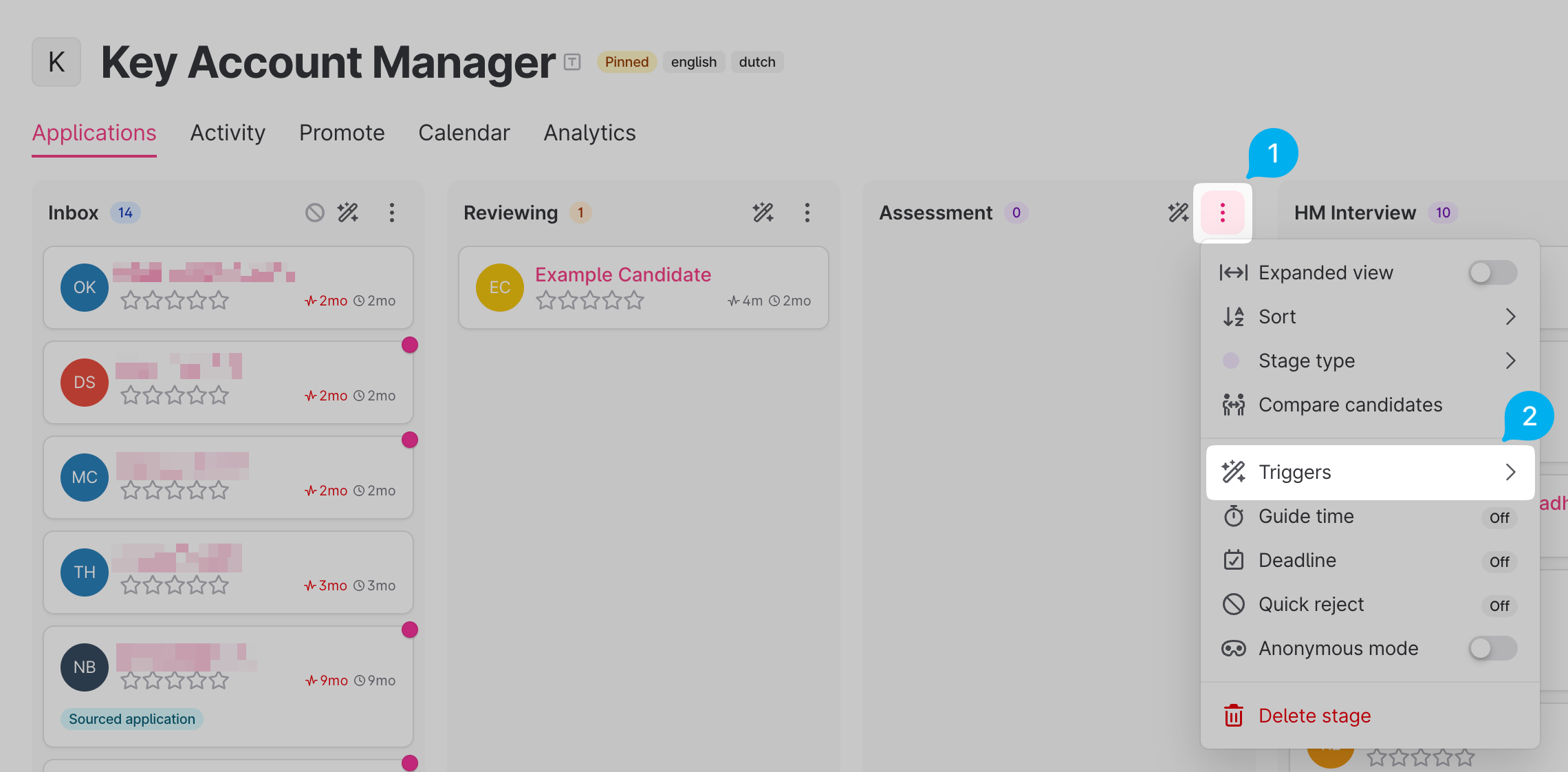 - Click on the "ellipsis" icon on the stage that you would like the candidates to be assessed on (we're using the "Assessment stage as an example in this guide), and click on the "Triggers" option from the dropdown: