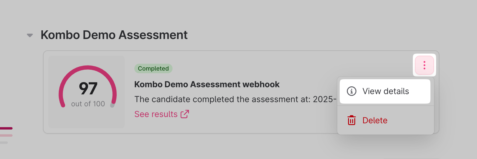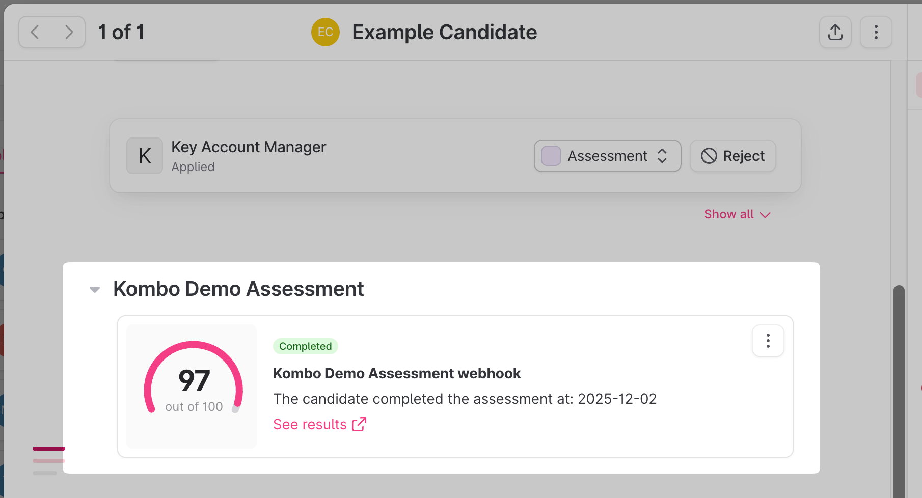 You can view the result of the assessment in the candidate's details page once it has been completed by the candidate