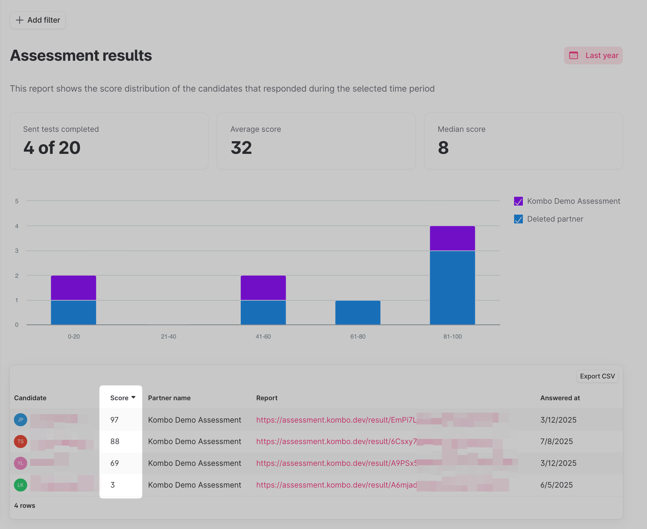 - You can then sort candidates by their test scores by clicking on the test score label: