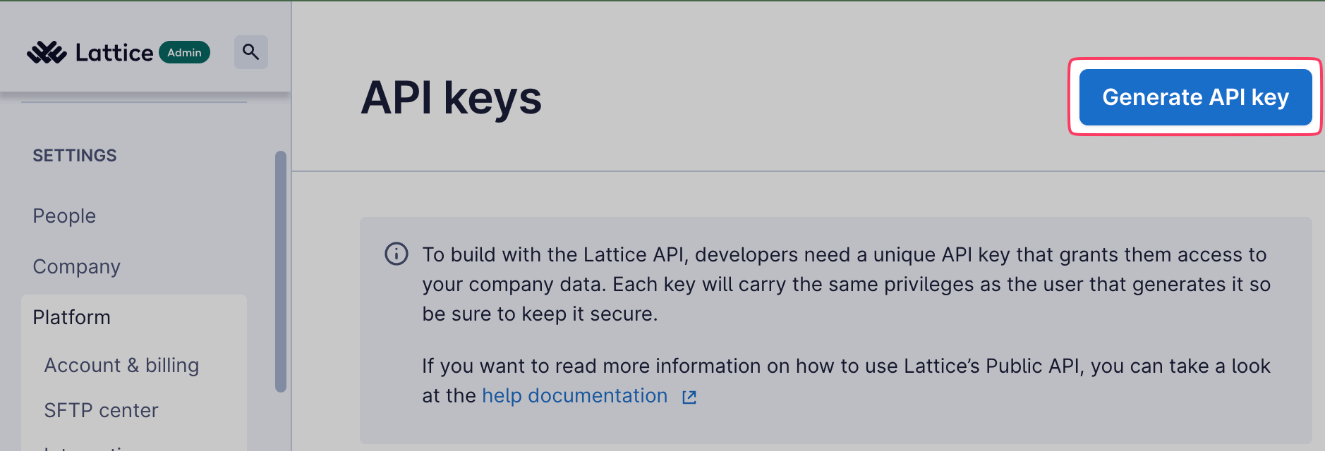 4. Click on the blue Generate API key in the top right corner of Lattice.