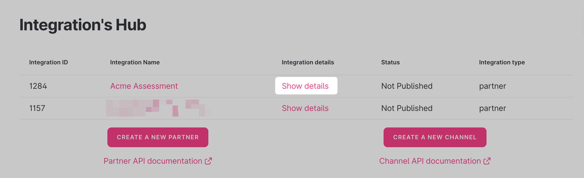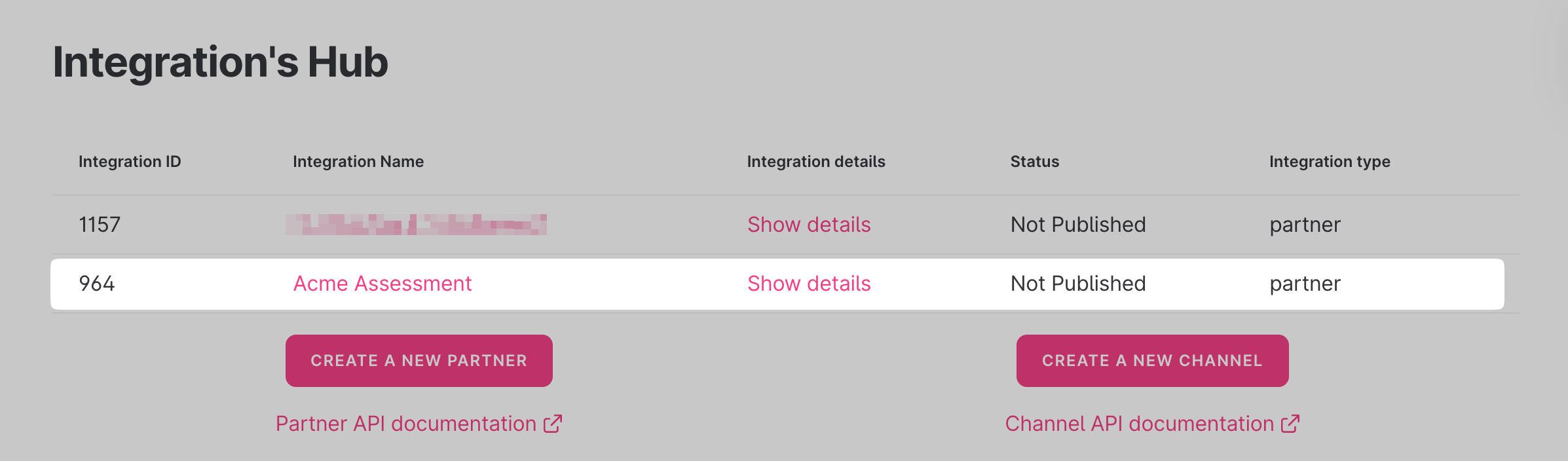 - You should be able to see your newly created partner integration inside the "Integration's Hub" Page, and its "Status" will be shown as "Not Published":